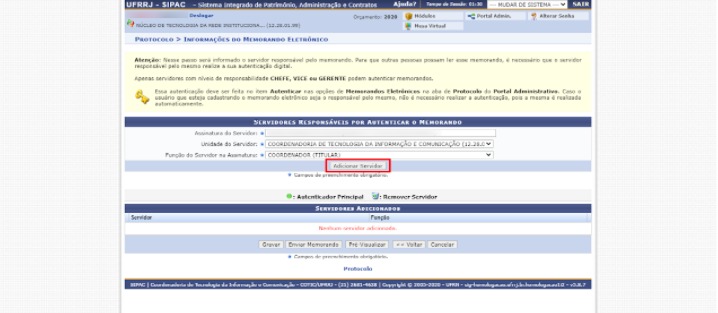 4. Na tela seguinte, selecione quais serão os servidores responsáveis por autenticar o memorando, sua unidade e função e clique em “Adicionar Servidor”;
