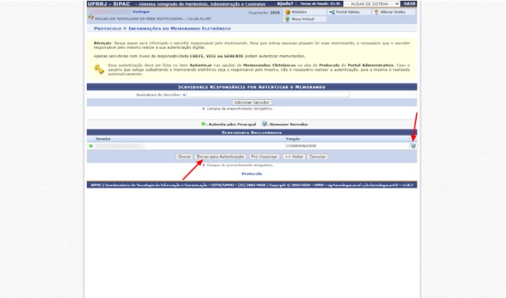 5. Para finalizar o cadastramento do memorando, clique em “Enviar para Autenticação”. O servidor responsável receberá um e-mail avisando que há um memorando pendente para sua autenticação;