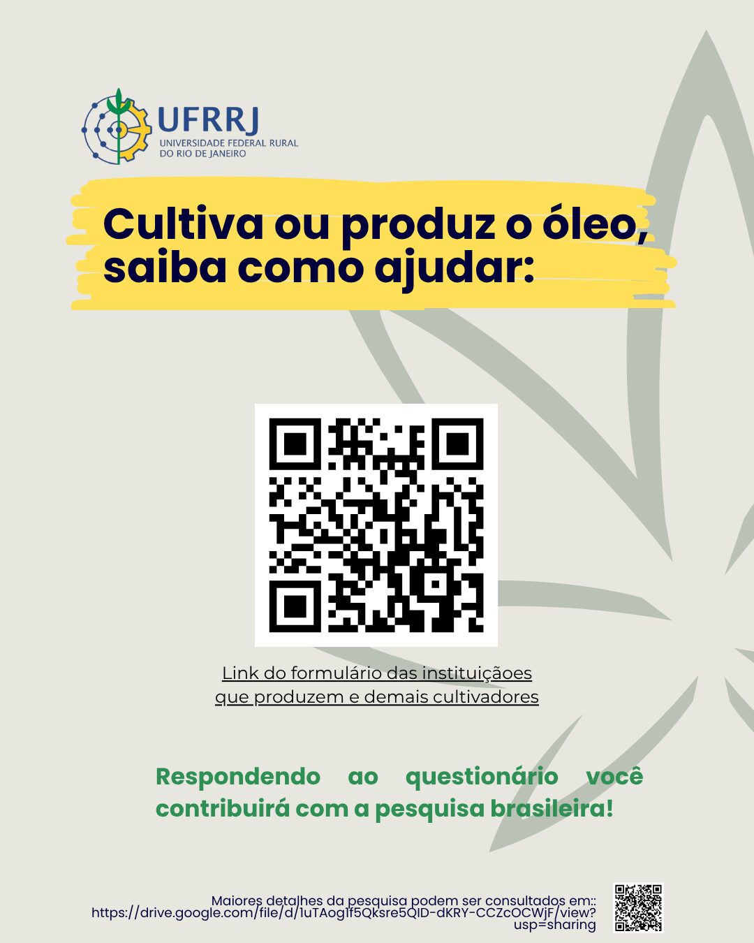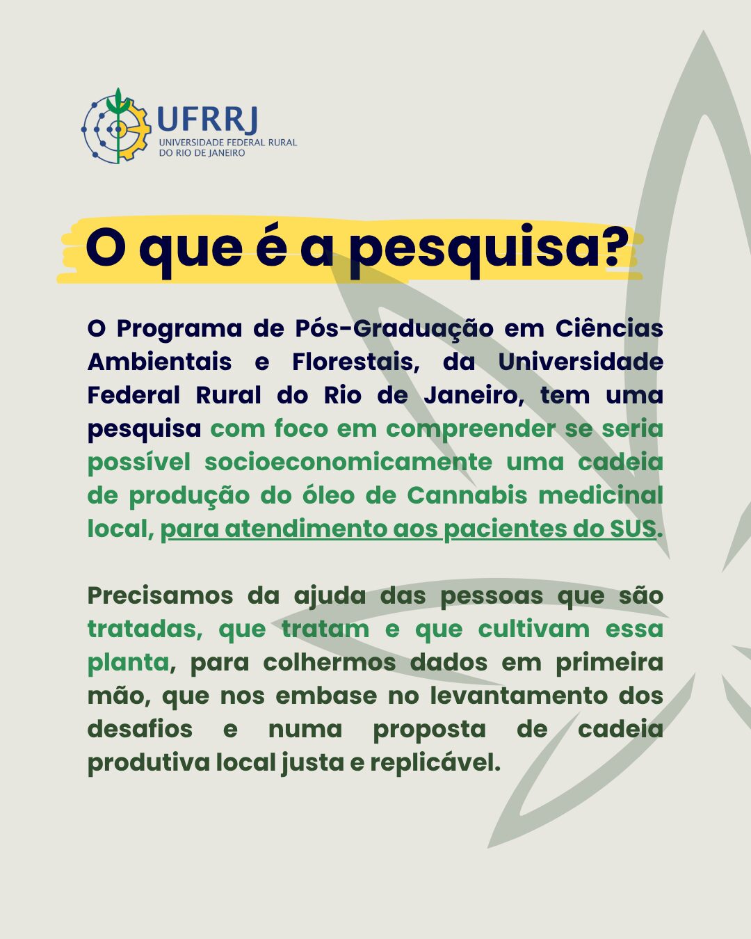 A pesquisa foi aprovada pelo Comitê de Ética em Pesquisa da UFRRJ e tem como objetivo compreender o perfil dos pacientes, prescritores e cultivadores de Cannabis medicinal, identificando custos, barreiras de acesso e alternativas de produção pública ou comunitária, de modo a subsidiar a formulação de políticas públicas mais justas e inclusivas.