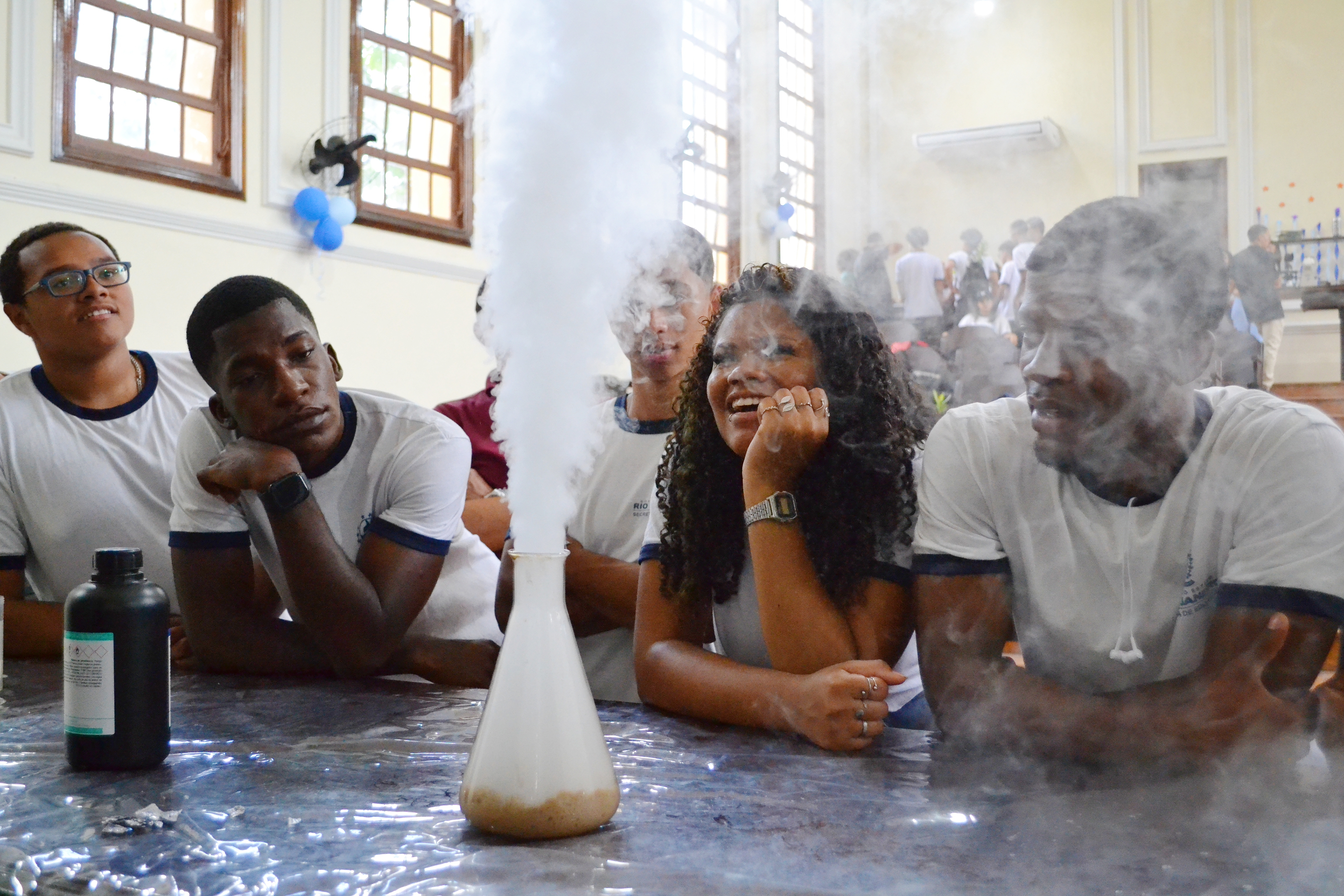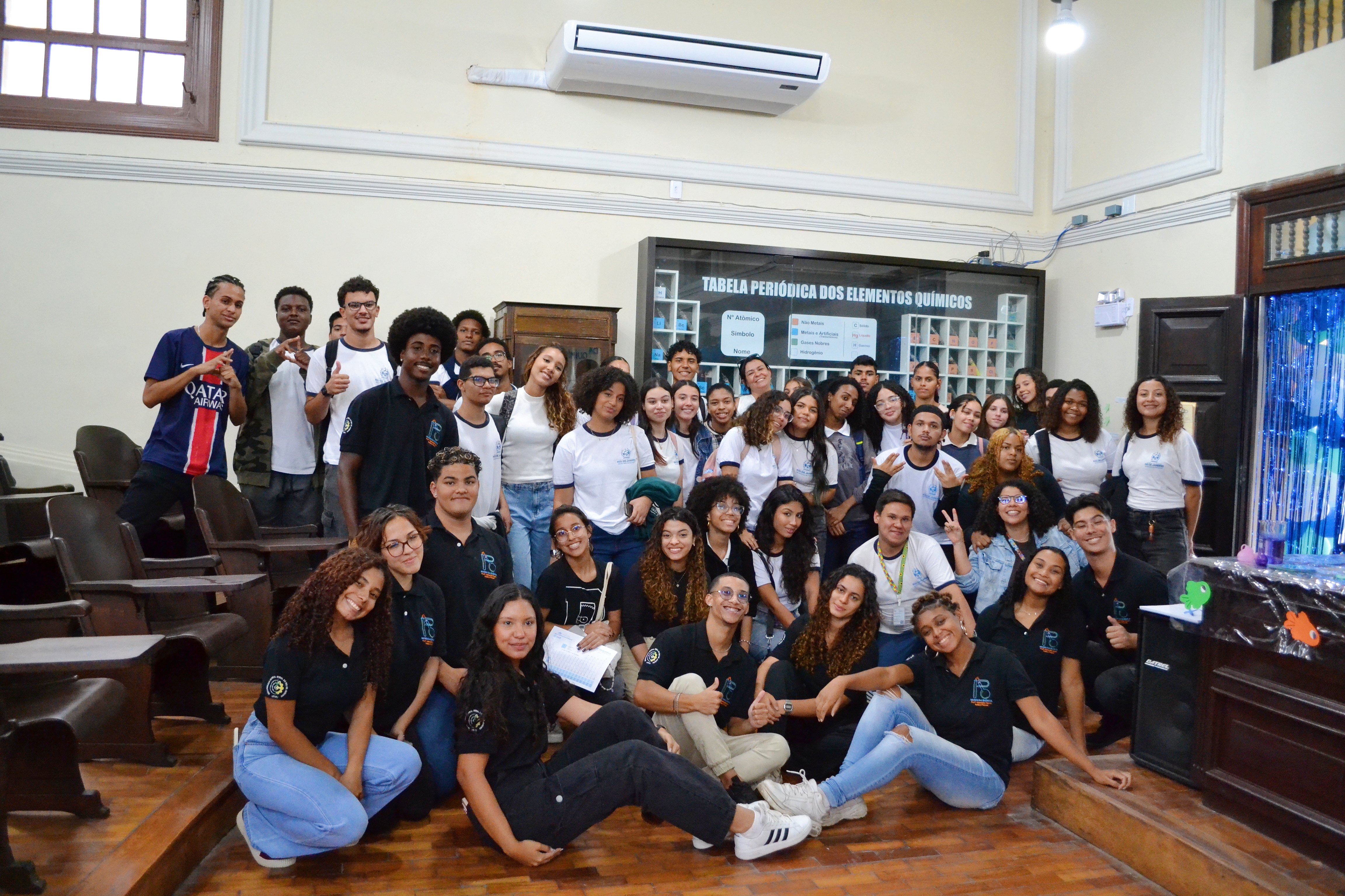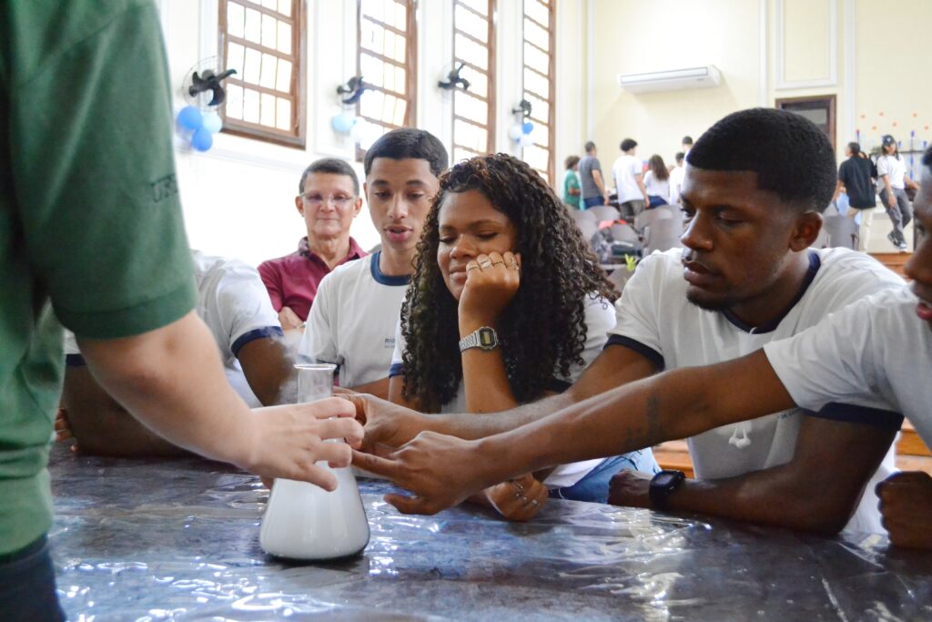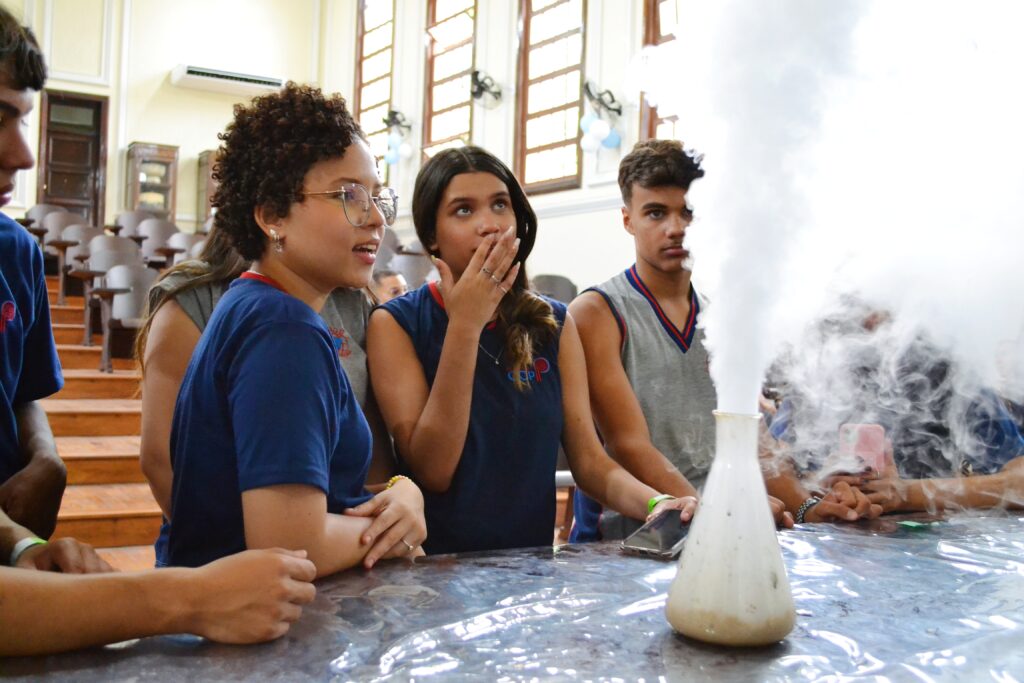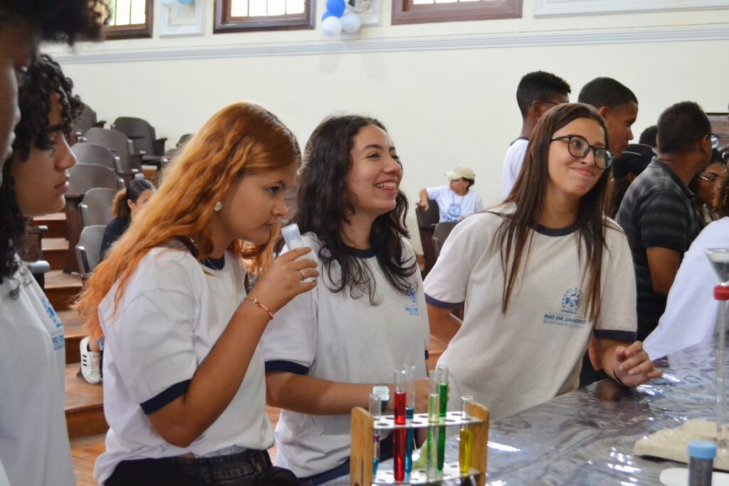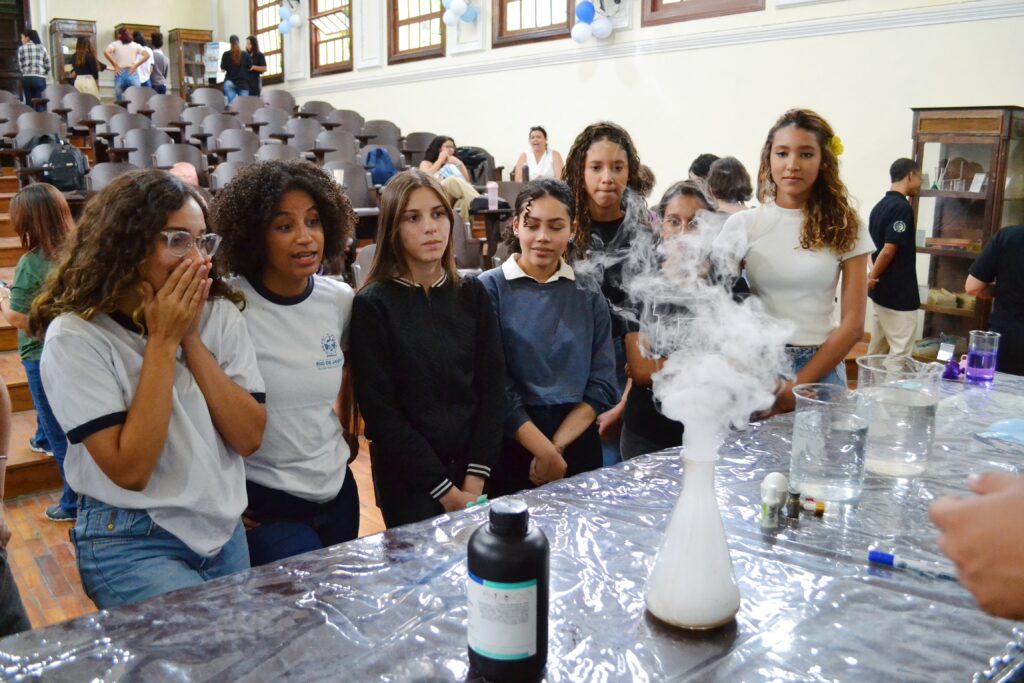 “Nós falamos para eles: ‘vocês já estão saindo daqui formados em química. São os futuros estudantes da Rural’. E os alunos gostam bastante, sempre falam que vão voltar outras vezes”, comentou Bruna Soares, aluna do curso de Química Industrial e voluntária do Museu da Química.