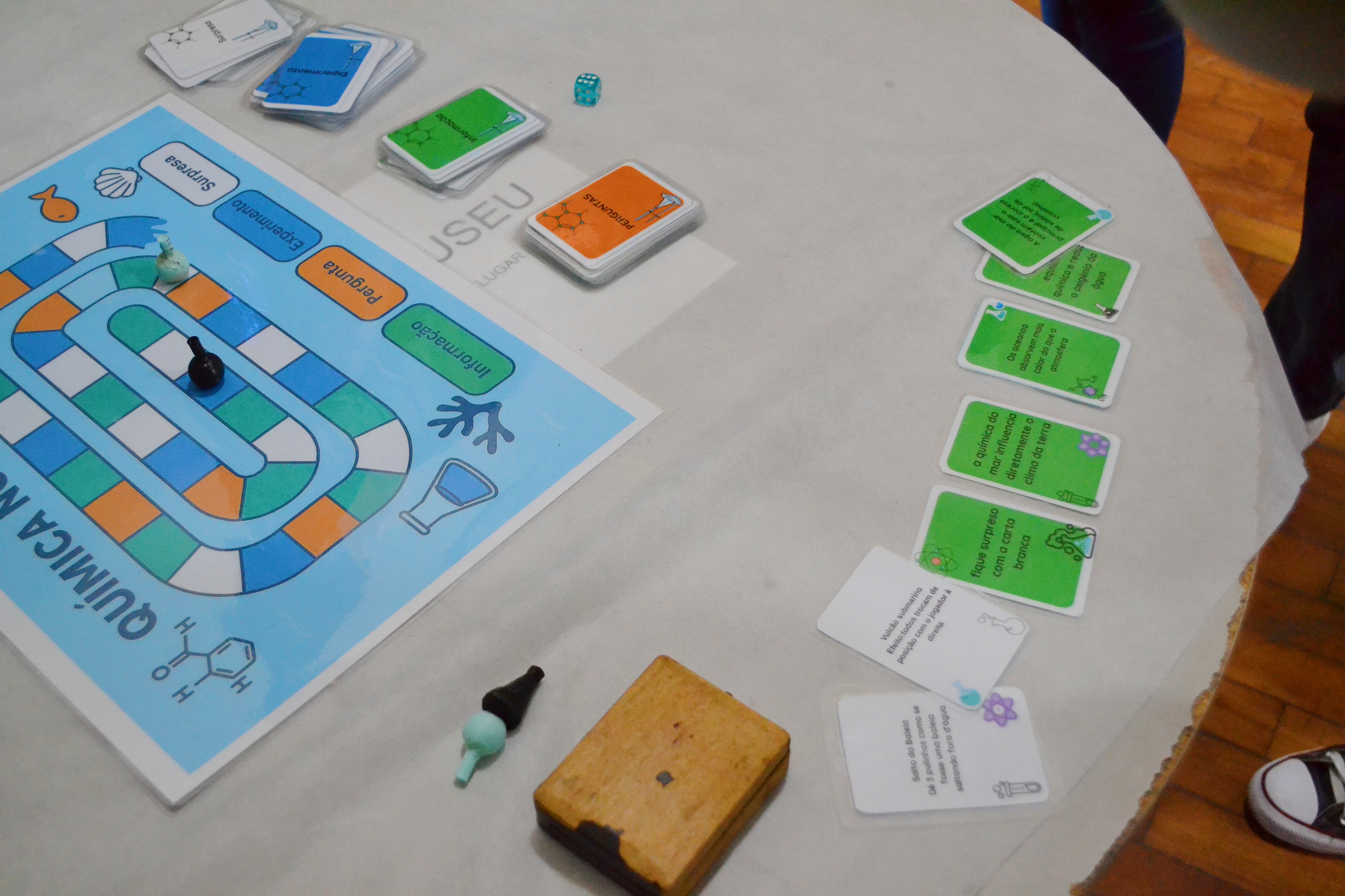 Em uma das fotos, é possível observar um jogo de tabuleiro que explora a química presente nos oceanos. As cartas traziam curiosidades, informações e perguntas sobre o mar e sua relação com a ciência, criando uma dinâmica leve e divertida.