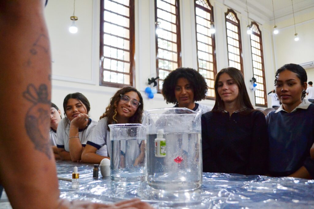 Em um dos experimentos apresentados, o objetivo era demonstrar a diferença de densidade entre a água doce e a água salgada. Para isso, a equipe utilizou dois recipientes, um com água doce e outro com água salgada, e lançou diferentes objetos. Os estudantes precisavam observar o comportamento dos objetos e determinar em qual dos recipientes cada um flutuava ou afundava. Ao final do experimento, os alunos aprenderam que a água salgada é mais densa por conta dos sais dissolvidos, o que explica por que os objetos, e até mesmo as pessoas, flutuam com mais facilidade no mar.