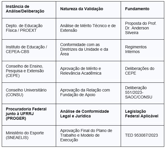 Diante dessa restrição temporal, a alternativa técnica e juridicamente viável para a execução dos recursos federais foi a utilização de uma Fundação de Apoio, modelo previsto em lei e devidamente credenciada junto à UFRRJ. É importante ressaltar que este modelo de execução foi submetido e aprovado pela SNEAELIS e pelo Ministério dos Esportes, órgão concedente dos recursos.