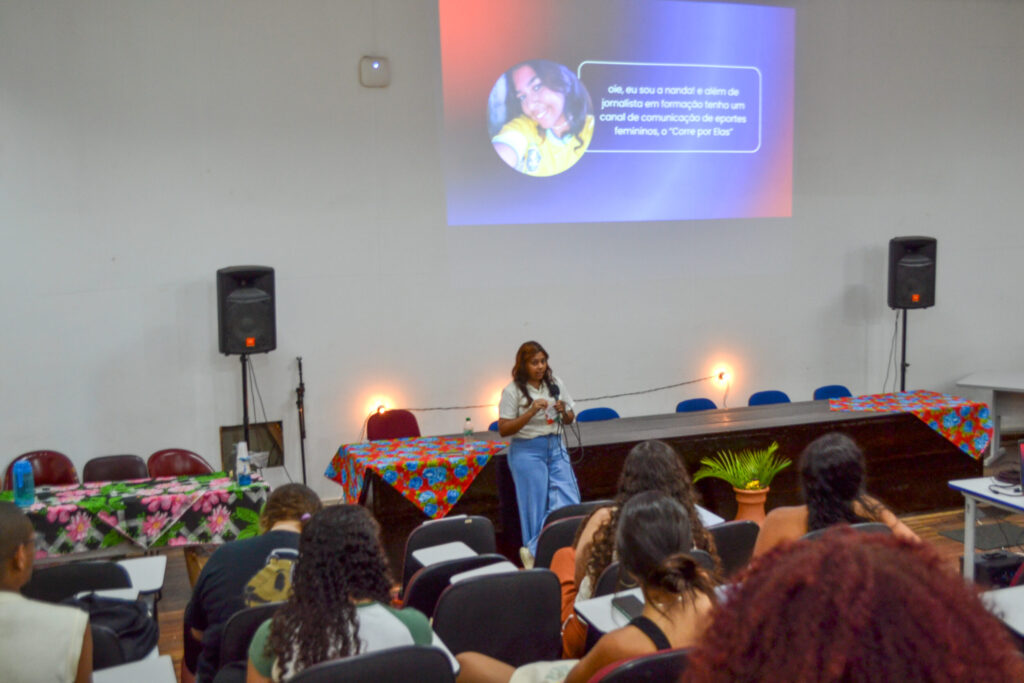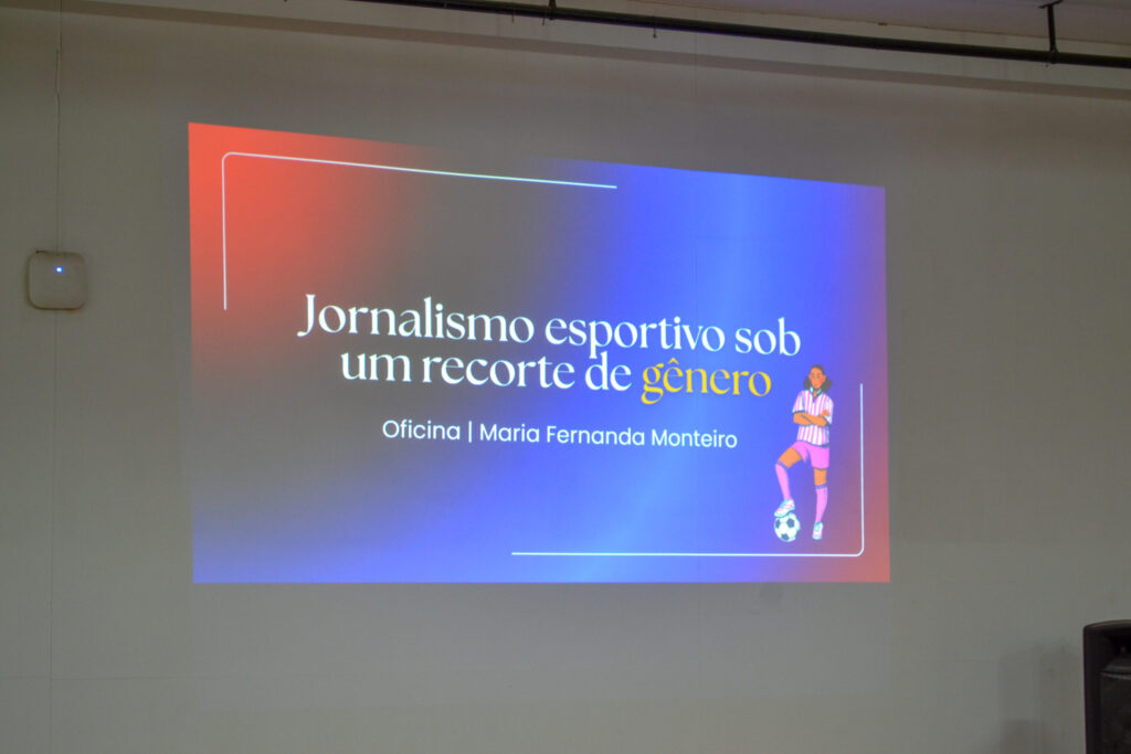 Durante a oficina, Maria Fernanda apresentou o Corre por Elas, projeto de cobertura esportiva feminina idealizado por ela e outras colegas a partir da percepção de estereótipos frequentemente reforçados pela imprensa na abordagem de atletas mulheres. A estudante também contextualizou o histórico de exclusão feminina no esporte, lembrando que, até meados do século XX, mulheres chegaram a ser proibidas de praticar determinadas modalidades no Brasil.