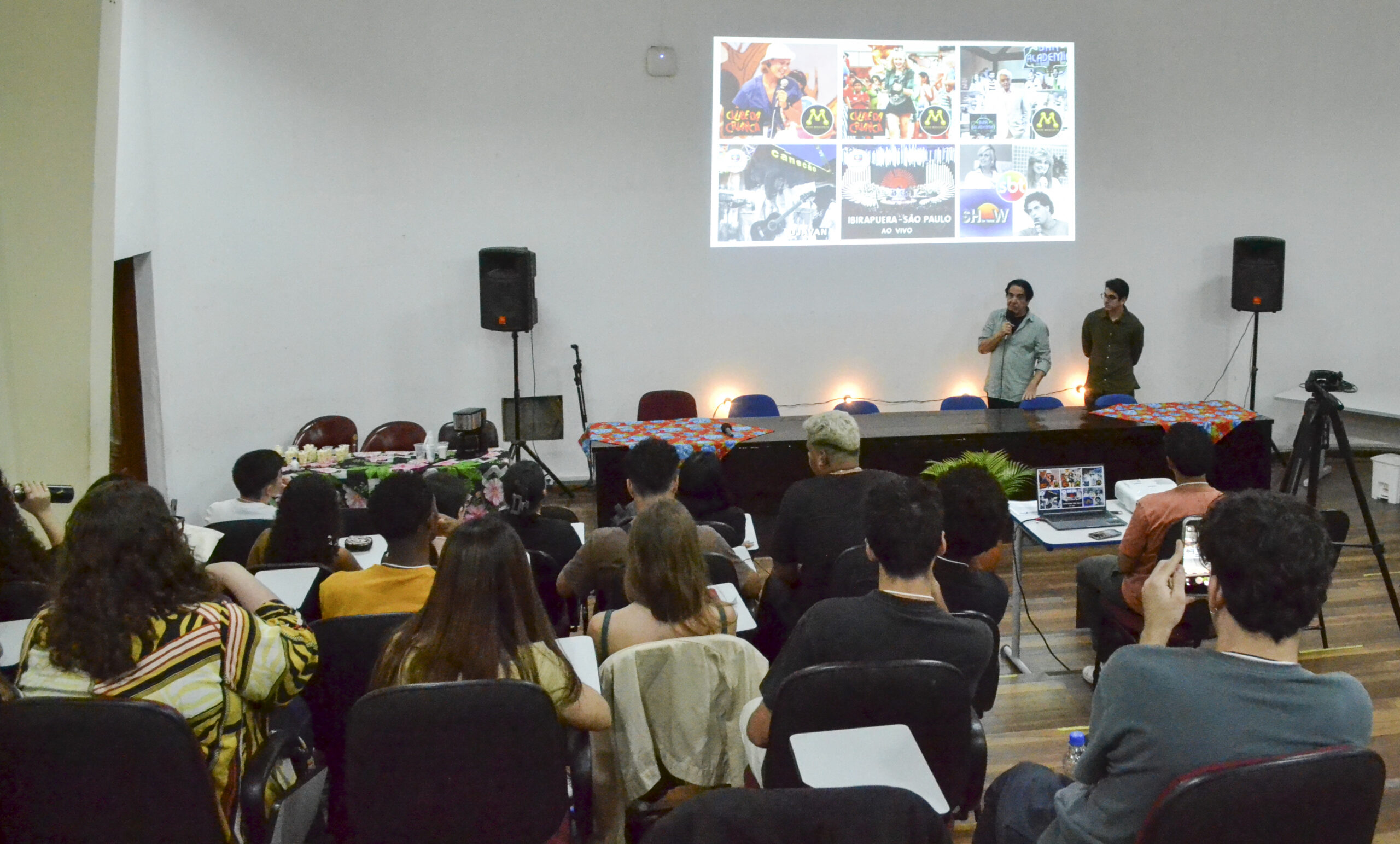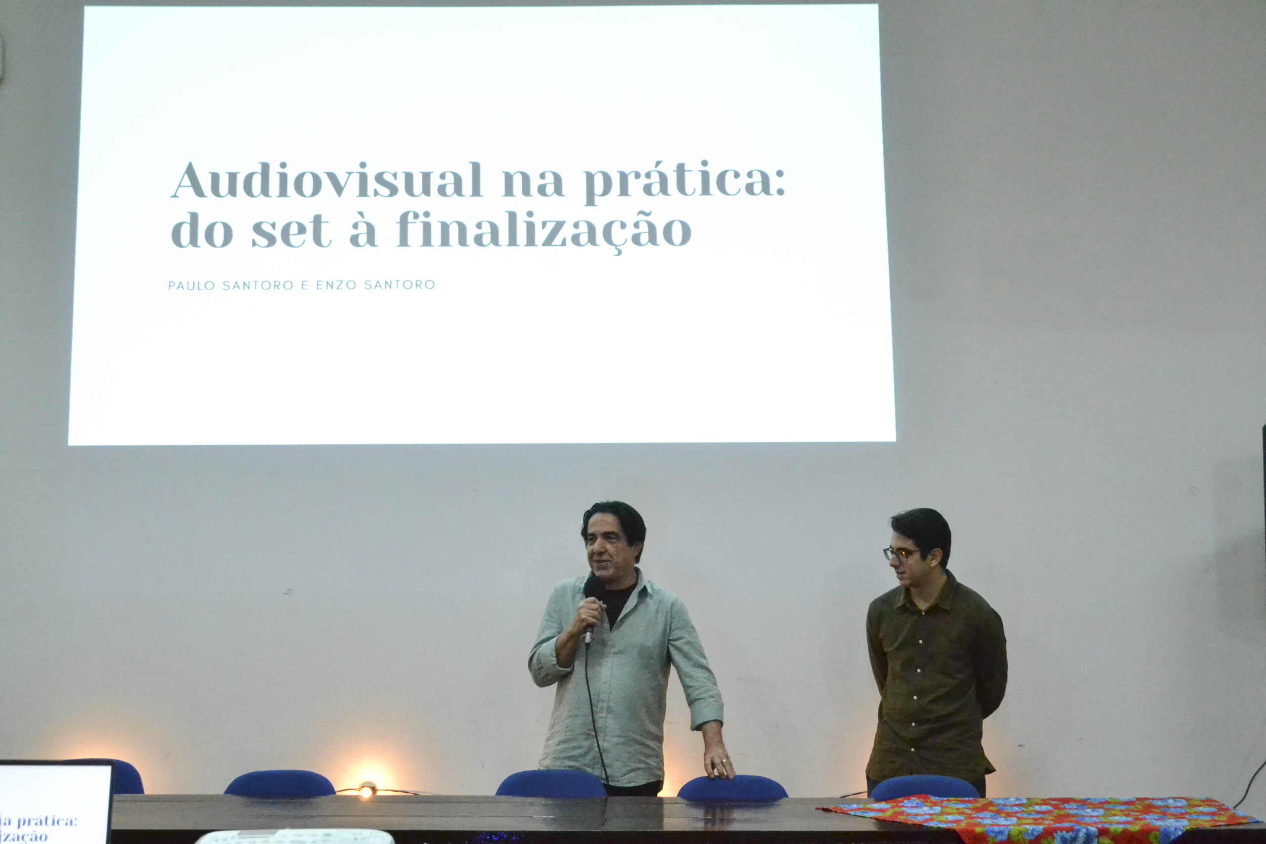 A 8ª Semana Acadêmica de Jornalismo da UFRRJ começou com uma imersão nos bastidores da produção audiovisual. Realizada em 3 de novembro, a oficina “Audiovisual na prática: do set à finalização” trouxe o cenógrafo e roteirista Paulo Santoro e o designer Enzo Santoro ao auditório Paulo Freire para discutir os bastidores do audiovisual e as novas tecnologias do setor.