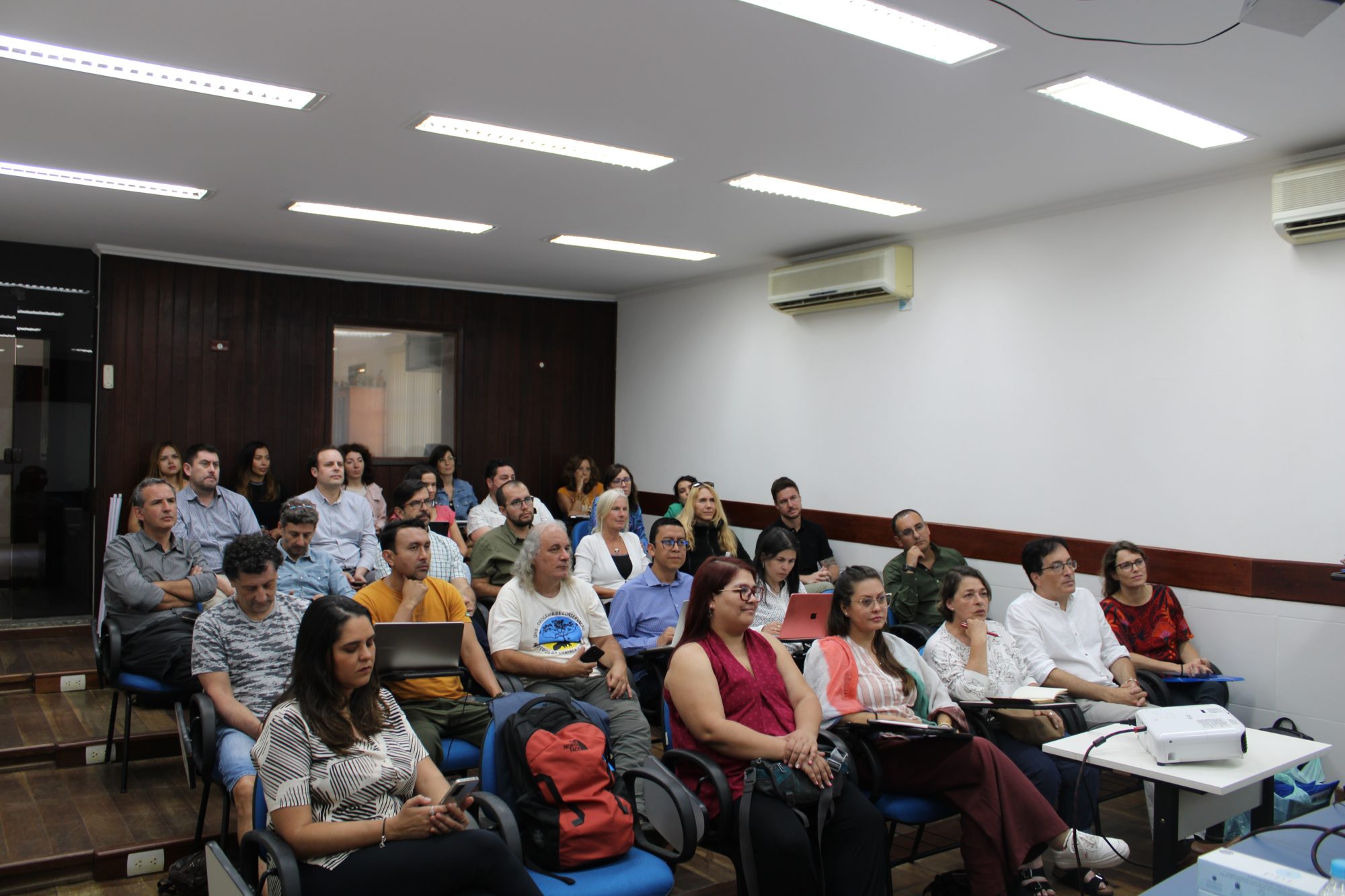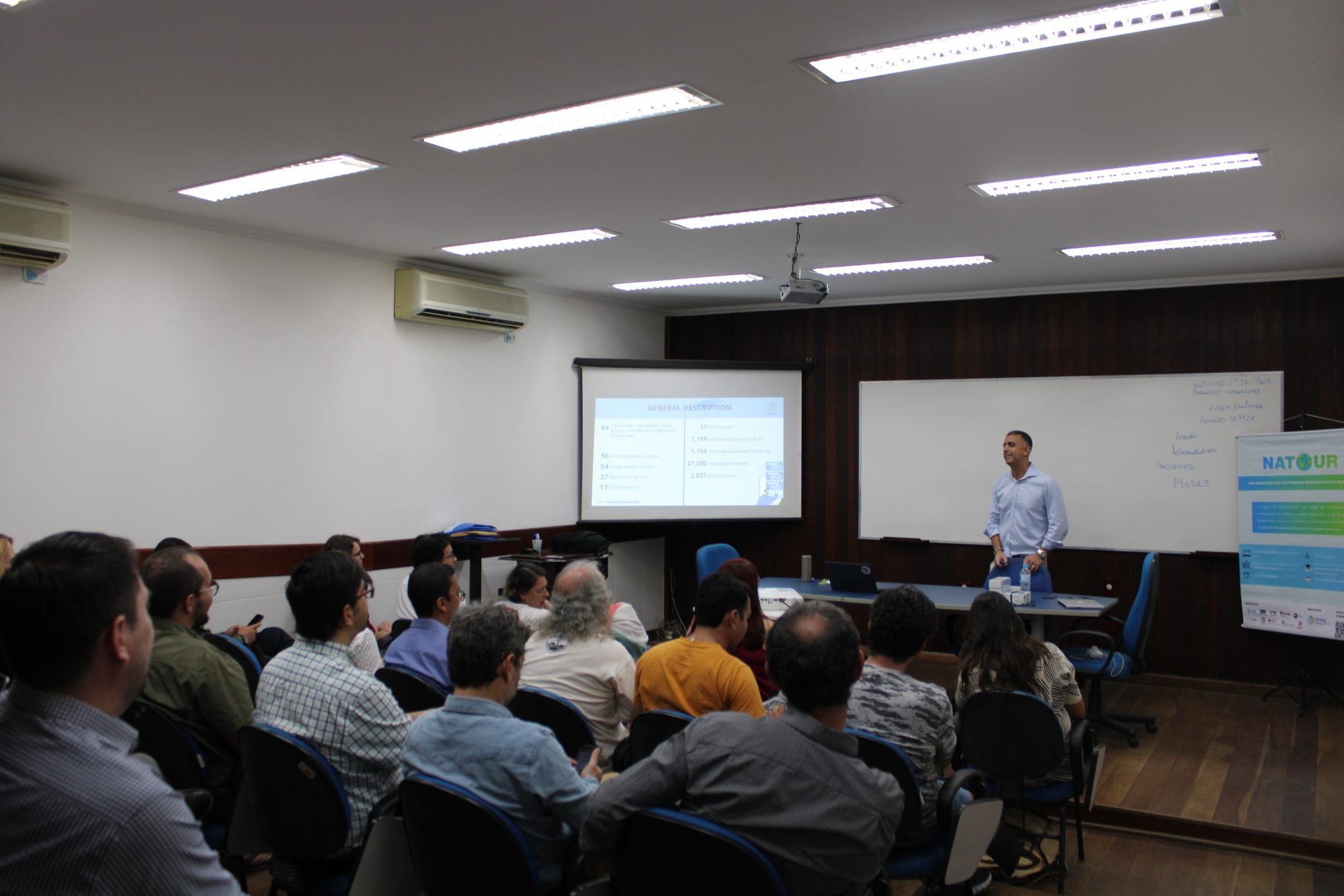 O professor Leandro Fontoura, coordenador do Natour Brasil, apresentou o projeto e as universidades participantes. Já a professora Shana Mattos deu as boas-vindas em nome da Coordenadoria de Relações Internacionais e Interinstitucionais (Corin), sublinhando que o projeto pode contar com a colaboração de seu setor. A seu lado estava o atual pró-reitor de Pesquisa e Pós-Graduação, José Luis Luque, que ocupou a coordenação da Corin entre 2017 e 2022. Seu papel para a consolidação da política de internacionalização da Universidade foi ressaltado pelo vice-reitor César Da Ros.