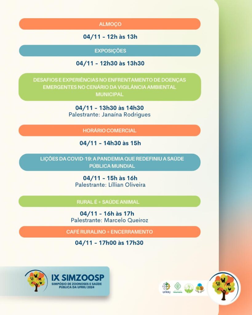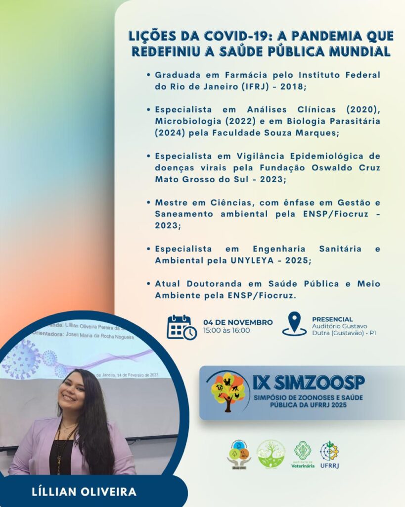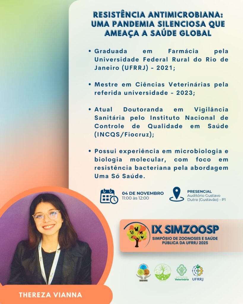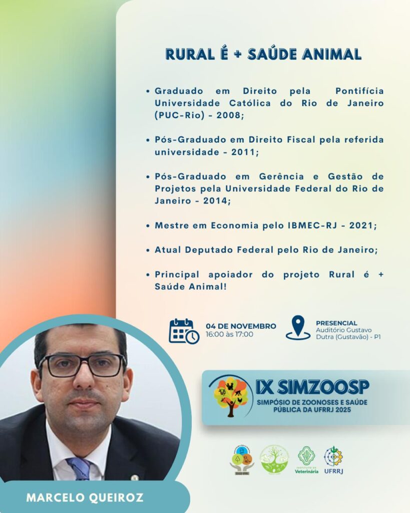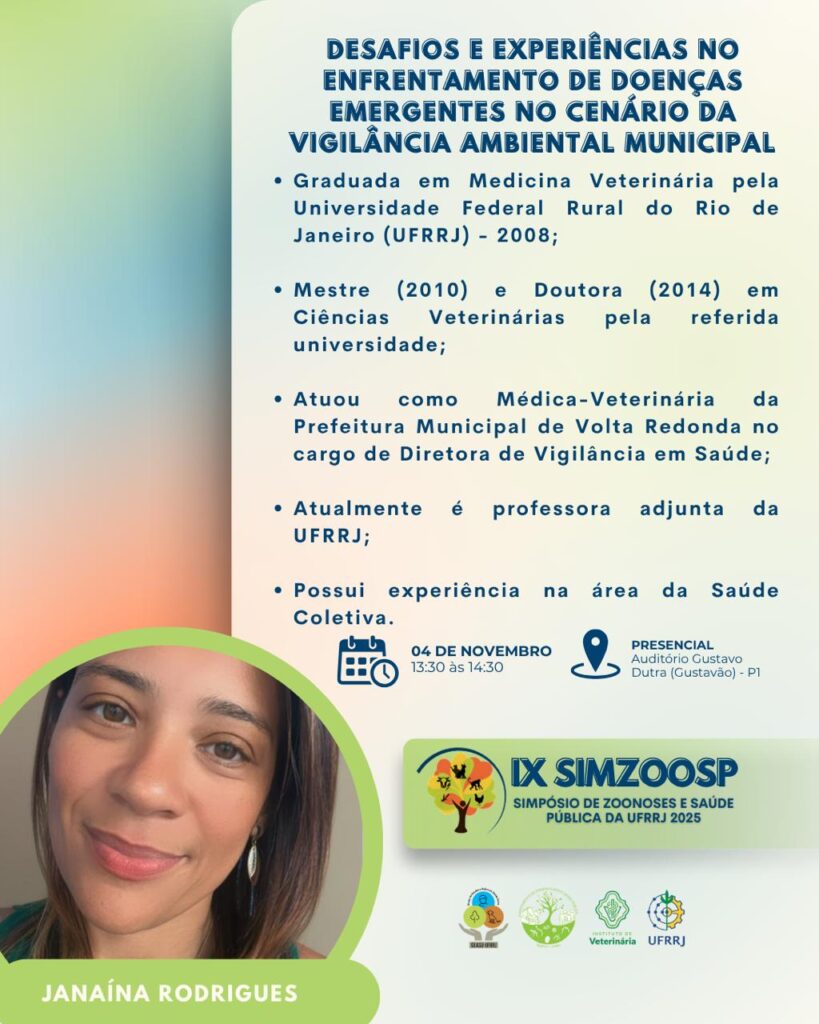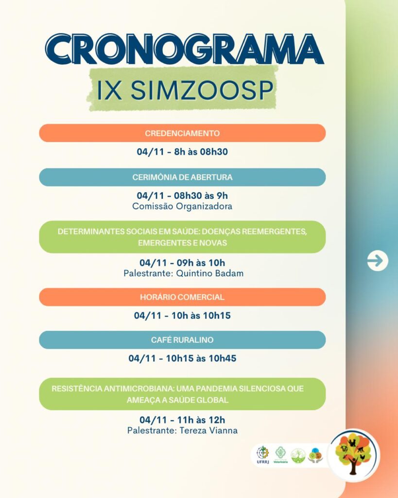 O IX SIMZOOSP (Simpósio de Zoonoses e Saúde Pública) da Universidade Federal Rural do Rio de Janeiro (UFRRJ) ocorrerá no dia 04 de novembro, no Auditório Gustavo Dutra (Gustavão), Pavilhão Central (P1), câmpus Seropédica.