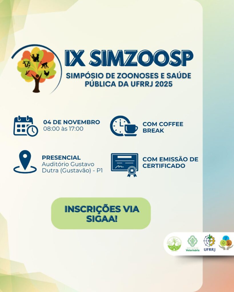 O IX SIMZOOSP (Simpósio de Zoonoses e Saúde Pública) da Universidade Federal Rural do Rio de Janeiro (UFRRJ) ocorrerá no dia 04 de novembro, no Auditório Gustavo Dutra (Gustavão), Pavilhão Central (P1), câmpus Seropédica.
