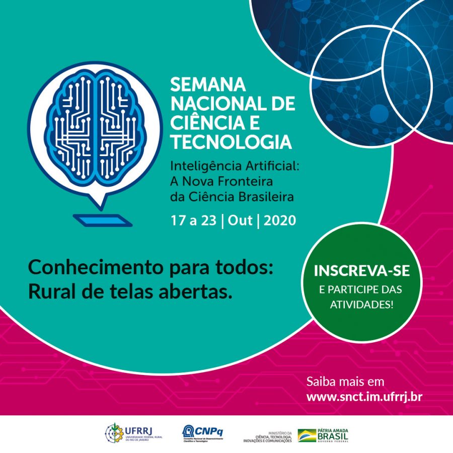 As inscrições para participantes da Semana Nacional de Ciência e Tecnologia 2020 (SNCT) podem ser feitas a partir desta quarta-feira, 30/9. A programação do evento traz diversas atividades, oferecidas apenas por meios online, além de materiais informativos sobre projetos da UFRRJ a serem divulgados nos sites e redes sociais.