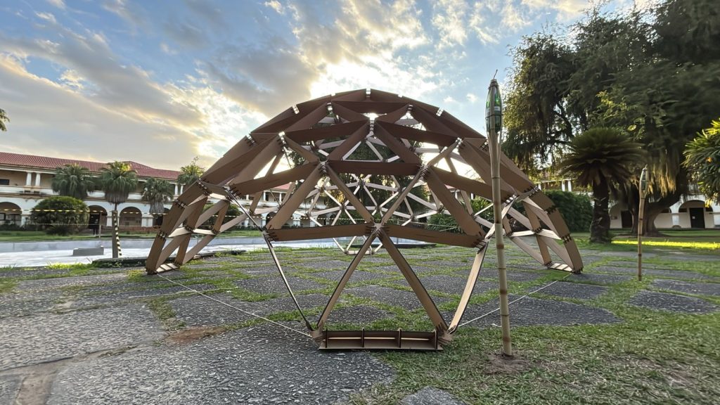 A primeira Oca, em 2023, cabia literalmente um estudante dentro. Com 3 m² e formato semiesférico, ela foi carinhosamente testada em ensaio destrutivo — os alunos encheram um recipiente d’água até a estrutura ceder, como verdadeiros engenheiros. A conclusão? As ligações eram o ponto fraco. Redesenhadas com um pequeno ajuste geométrico, a resistência do sistema quintuplicou. Ciência na prática.