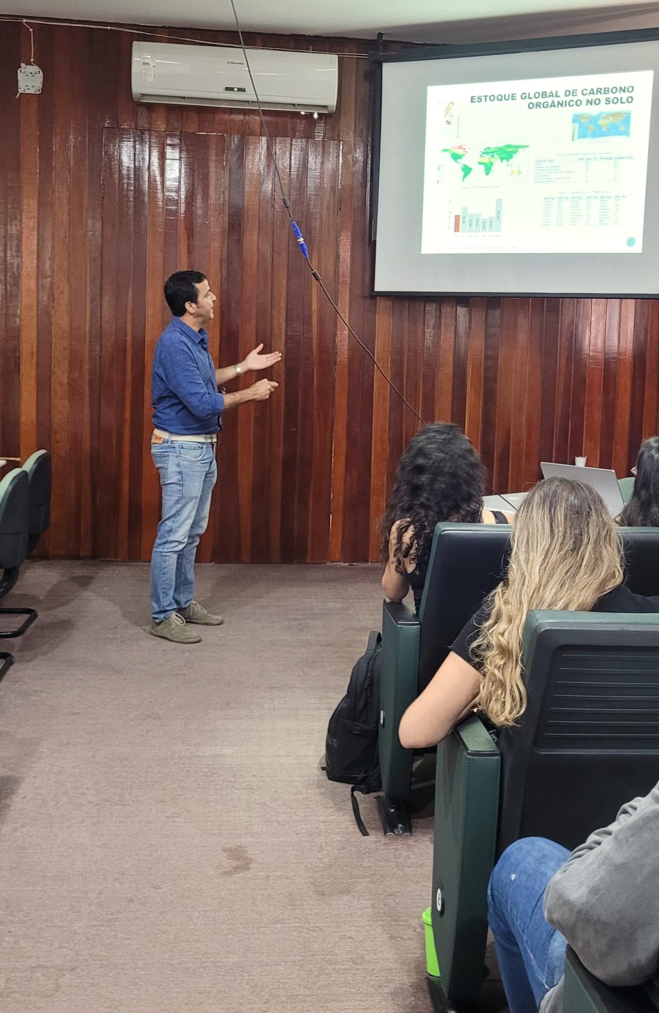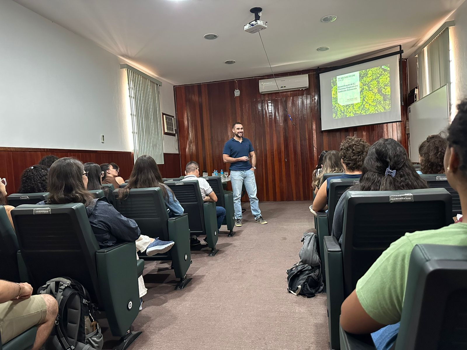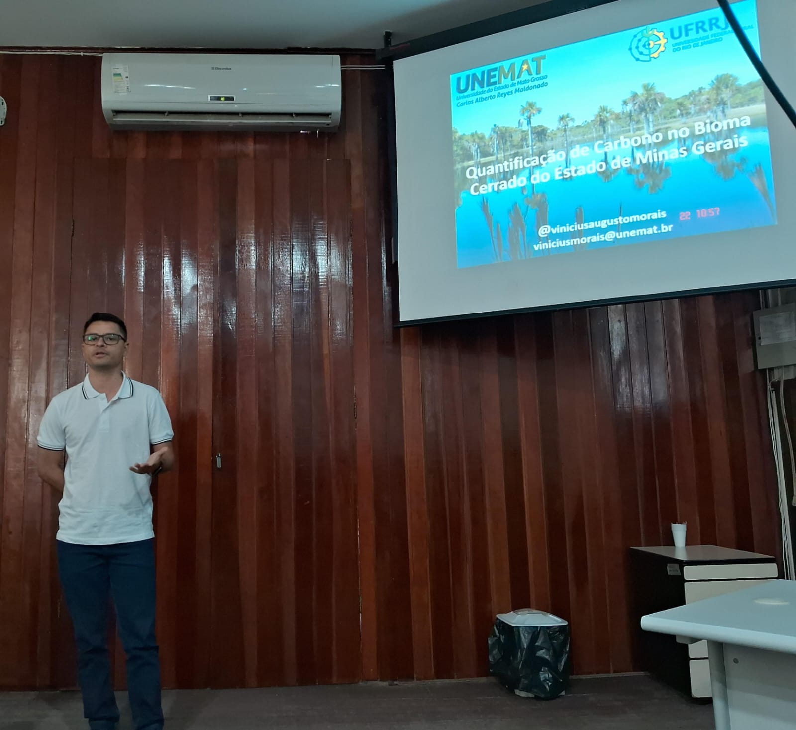 As palestras começaram com o professor Vinícius Morais, da Universidade do Estado de Mato Grosso (UNEMAT), que compartilhou suas pesquisas sobre a quantificação de carbono no bioma cerrado do estado de Minas Gerais. O docente detalhou suas contribuições significativas na avaliação do carbono presente na serrapilheira, raízes de plantas e no solo em todo o estado de Minas.