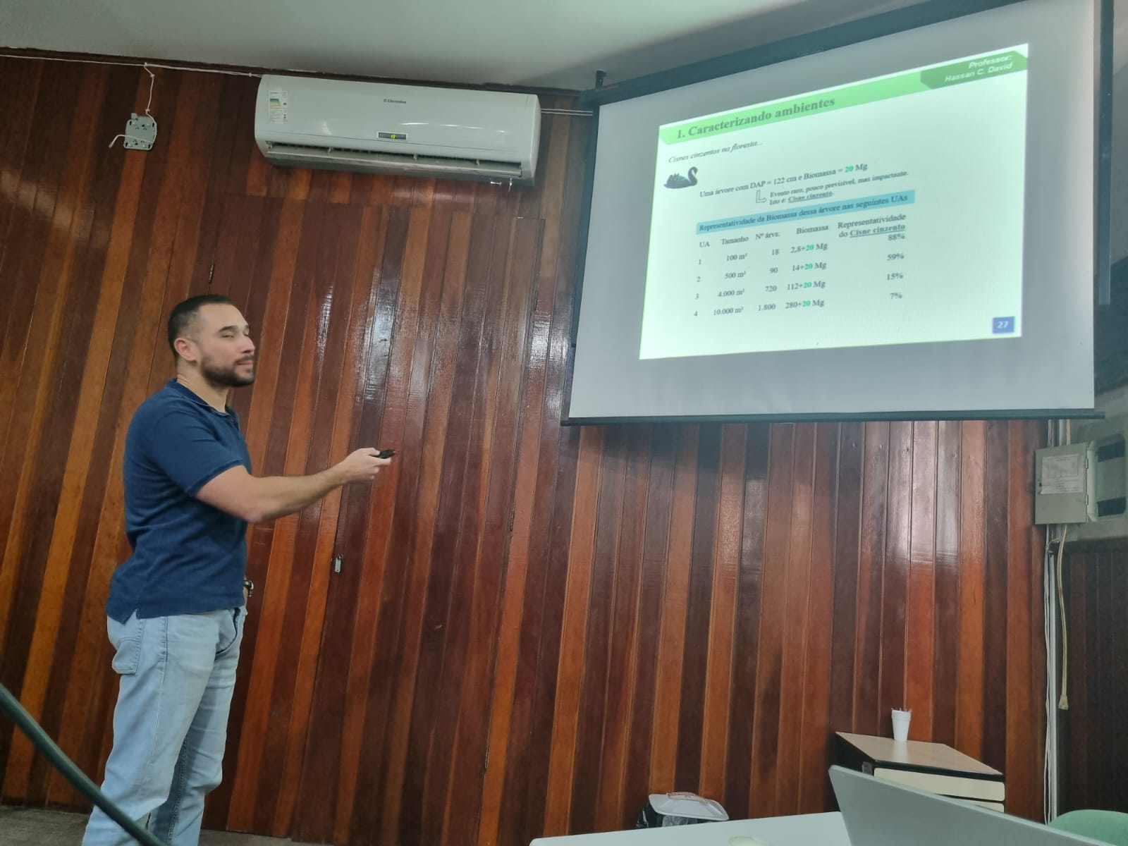 Por fim, o professor Hassan David, da Universidade Federal do Paraná (UFPR), criador do projeto Tropical Biomass and Carbon, apresentou sua palestra intitulada “Quantificação de Carbono, Florestas Tropicais e o Ambiente Extremistão”. Ele explorou os desafios da modelagem matemática da biomassa aérea de espécies florestais em ambientes extremos, como encontrados na Floresta Amazônica, que apresenta árvores de grande porte.