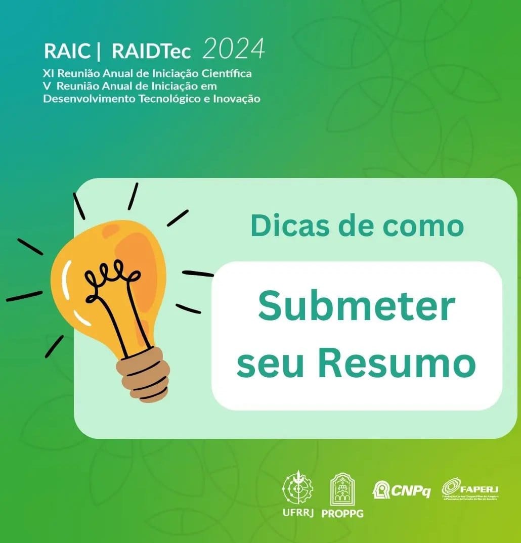 Estudantes de graduação e ensino médio bolsistas, ou não, envolvidos em atividades de pesquisa na Universidade Federal Rural do Rio de Janeiro (UFRRJ) ganharam novo prazo para submissão de resumos na XI Reunião Anual de Iniciação Científica (RAIC 2024), evento que compreende a V Reunião Anual de Iniciação em Desenvolvimento Tecnológico e Inovação (RAIDTec 2024), a XXXIII Jornada de Iniciação Científica (JIC 2024) e Iniciação Científica – Ensino Médio (JIC-EM) e a XI Semana de Pesquisa, Tecnologia e Inovação (SePTI 2024).