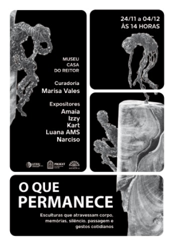 De 24/11 a 4/12, o Museu Casa do Reitor recebe a mostra “O que permanece: esculturas que atravessam corpo, memória, silêncio, passagem e gestos cotidianos” que apresenta os trabalhos finais do Projeto Artístico, eixo de Escultura do curso de Belas Artes da Universidade Federal Rural do Rio de Janeiro (UFRRJ).
