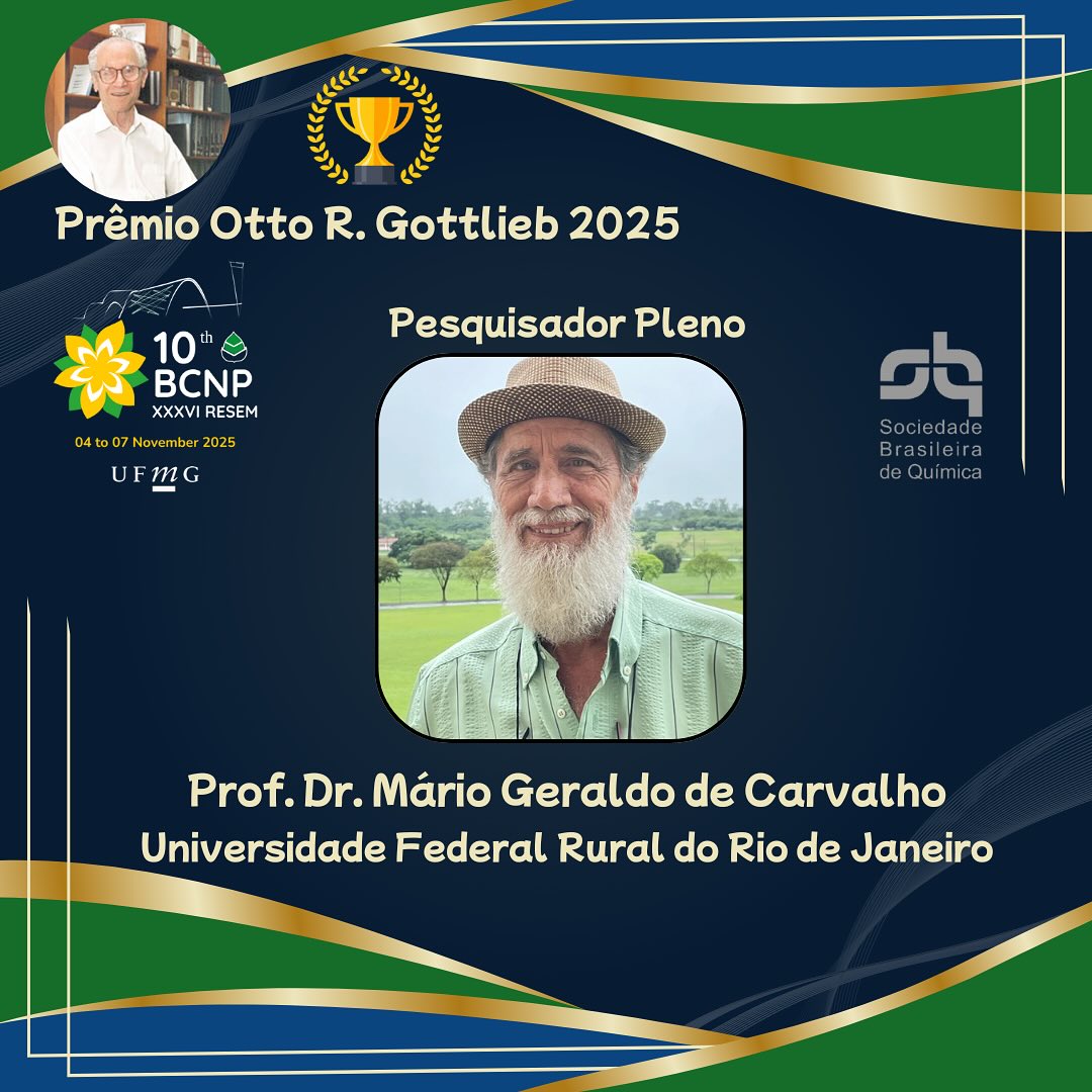 O professor Mário Geraldo de Carvalho (Departamento de Química/ICE/UFRRJ) foi um dos agraciados com o Prêmio Otto R. Gottlieb, edição 2025. A honraria, concedida pela Sociedade Brasileira de Química, foi entregue durante o 10º Congresso Brasileiro de Produtos Naturais, realizado na Universidade Federal de Minas Gerais (UFMG) entre os dias 4 e 7 de novembro de 2025.