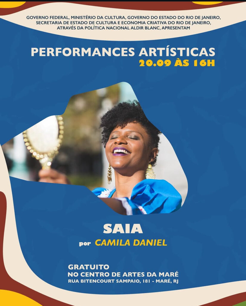 A performance “Saia” foi criada pela artista e professora Camila Daniel, que definiu sua apresentação como uma “escrevivência dançada”. Em cena, Camila costura gêneros afro-latinos: o Tondero e o Landó peruanos, a Rumba cubana e o Carimbó brasileiro.
