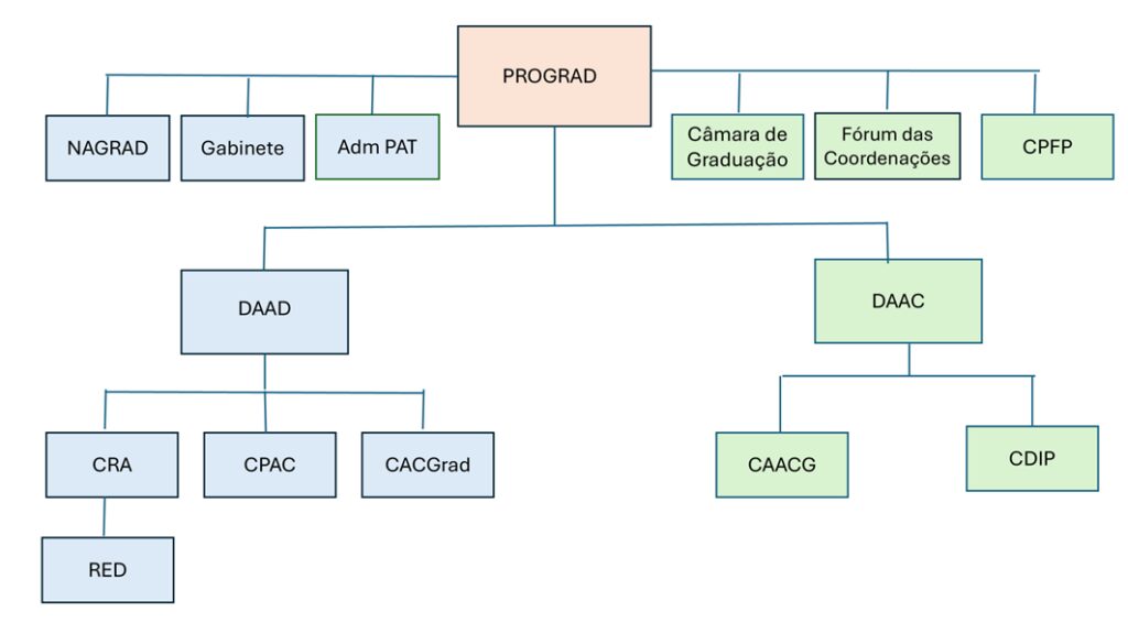 A estrutura organizacional da PROGRAD foi reformulada para fortalecer a gestão estratégica da graduação e assegurar maior integração entre as dimensões administrativa e acadêmica das políticas institucionais.
