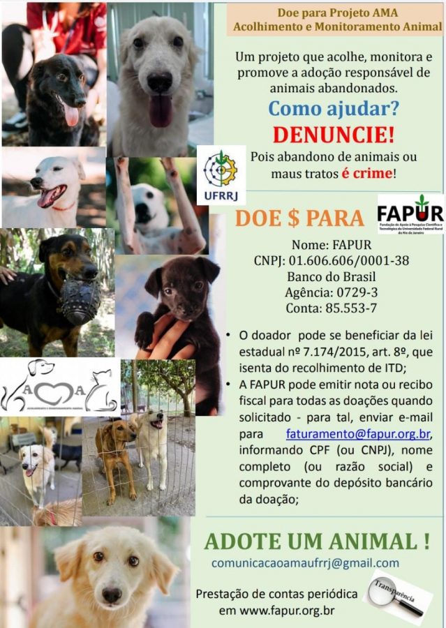Adoção: Há fotos dos animais sob os cuidados do AMA no perfil do Instagram @projetoamaufrrj e no Facebook: @projetoamaufrrj Para saber como adotar, envie e-mail para comunicacaoamaufrrj@gmail.com