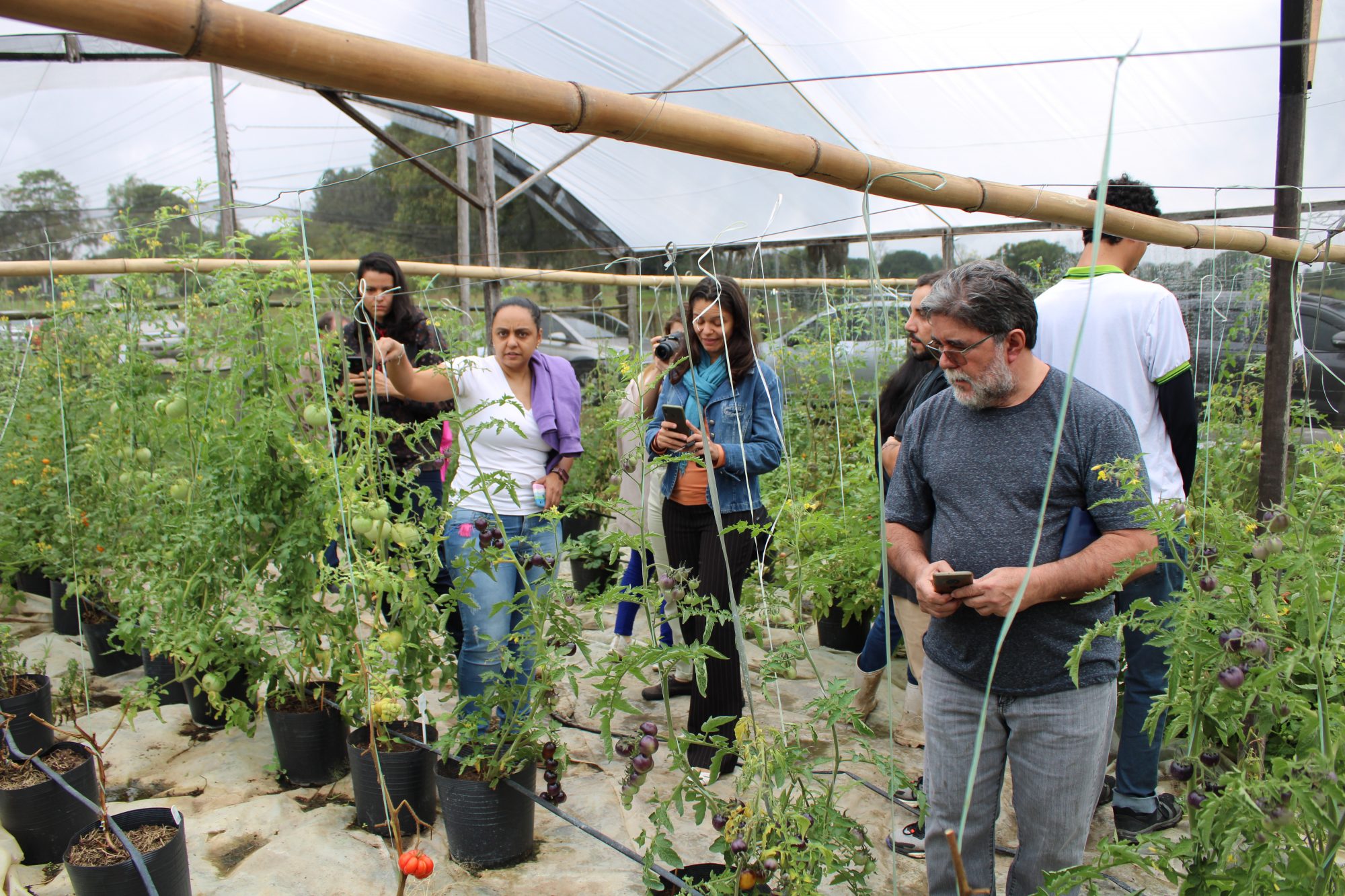 Na estufa de tomates, o professor Abboud falou sobre temas como o processo de cultivo de tomates especiais; a dificuldade da produção orgânica; a prevenção e controle doenças; e a grande diversidade de espécies, além das vantagens e desvantagens do plantio em vasos.