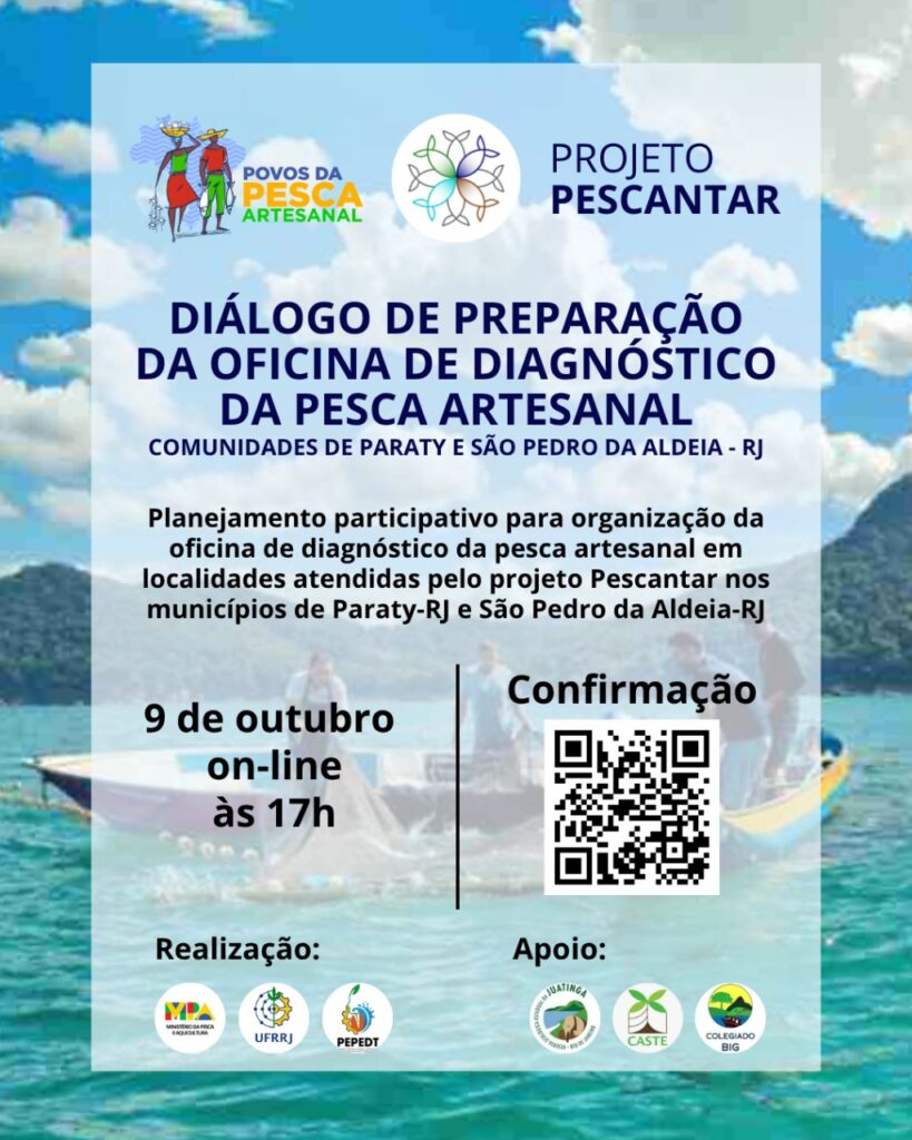 Na próxima quinta-feira, 9/10, o Projeto Pescantar irá realizar o diálogo de preparação para a oficina de diagnóstico da Pesca Artesanal nas comunidades pesqueiras de Paraty e São Pedro da Aldeia, no Rio de Janeiro. A reunião será realizada de forma remota (online), às 17 horas. Para se inscrever, basta preencher o formulário de confirmação disponível no link a seguir: https://forms.gle/T6xH7RDmgjcUBpXc7