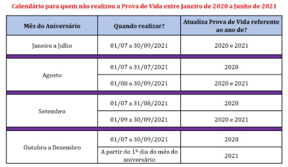 Quem não realizou a Prova de Vida em 2020 e/ou em 2021 desde a suspensão em 2020 até esta quarta-feira (30/6) deverá comprová-la, conforme calendário abaixo, na agência bancária onde recebe o pagamento, ou acessar o aplicativo SouGov.br para consultar a situação da comprovação de vida, o prazo para a sua realização e obter as orientações para realizá-la por meio de aplicativo móvel – caso tenha biometria cadastrada no Tribunal Superior Eleitoral (TSE) ou no Departamento Nacional de Trânsito (Denatran).