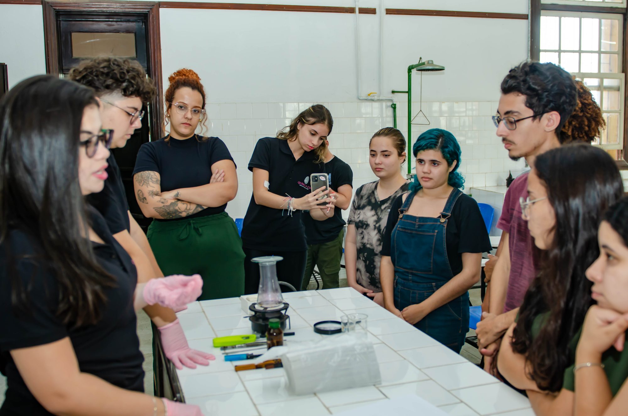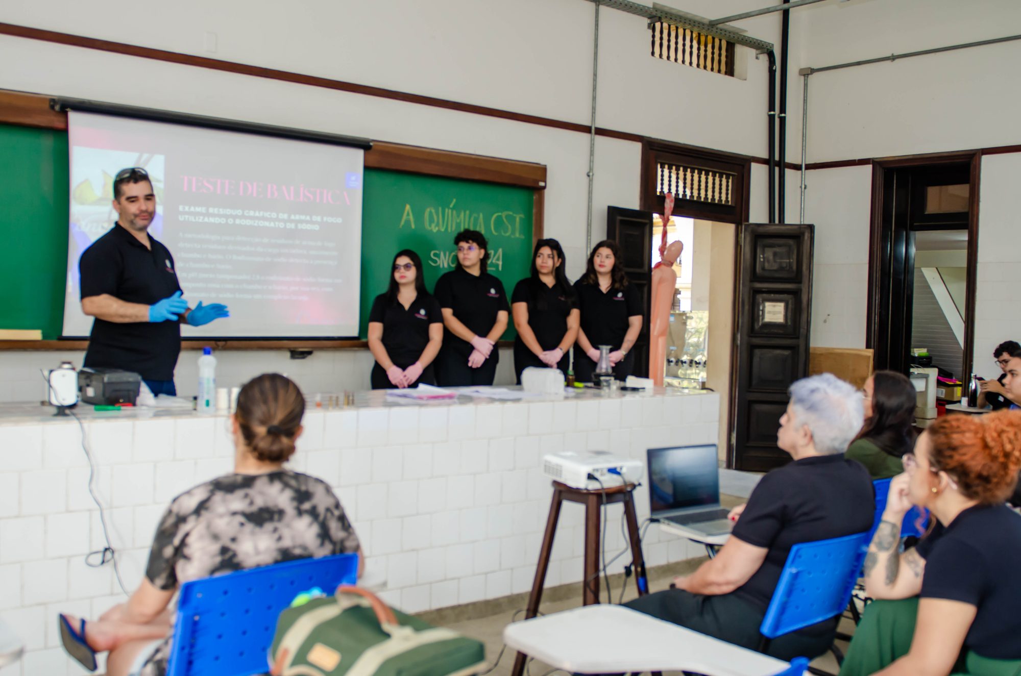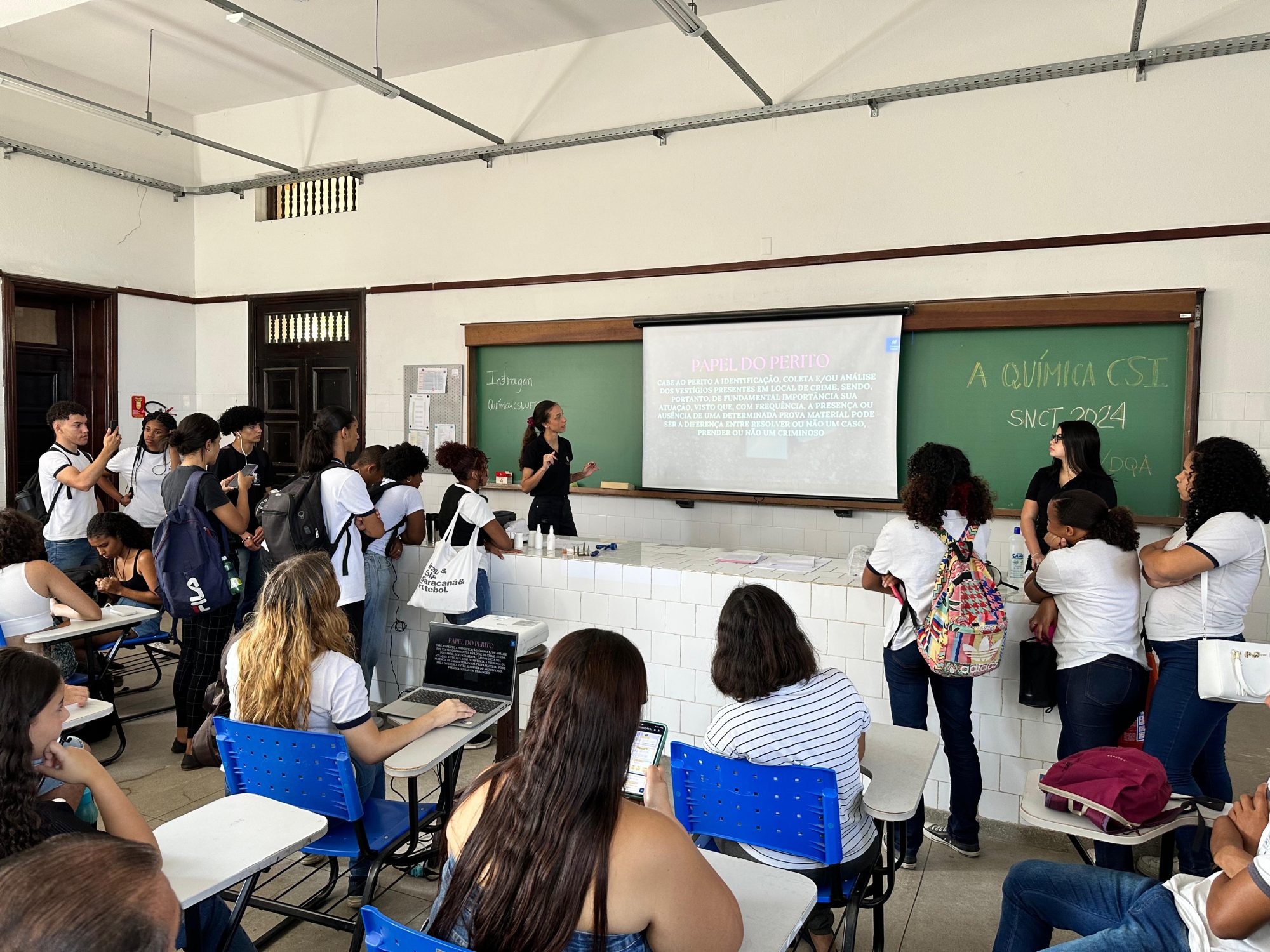 Cerca de 100 estudantes dos Ensinos Médio e Fundamental do Senai e Cefet, ambos de Itaguaí-RJ, e do Colégio Estadual Vicentina Goulart, de Nova Iguaçu, participaram do Química CSI, atividade desenvolvida no Laboratório de Química Analítica, do Instituto de Química, nos dias 16 e 17/10 para a 21ª Semana Nacional de Ciência e Tecnologia (SNCT) . A atividade investigativa e interativa levou os visitantes a desvendarem um suposto crime.