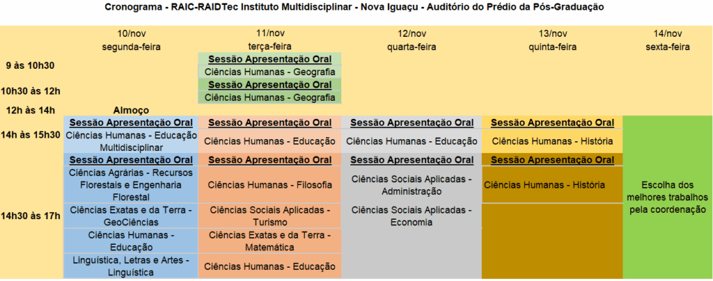 No Instituto Multidisciplinar (IM), em Nova Iguaçu, as atividades da RAIC ocorrerão no Auditório do Prédio da Pós-Graduação, de 10 a 13/11. A programação foca nas apresentações orais de diversas áreas do conhecimento: Ciências Humanas (Geografia, Educação, Filosofia, História), Ciências Sociais Aplicadas (Administração, Economia, Turismo), Ciências Exatas e da Terra e Ciências Agrárias. Confira o cronograma detalhado, com data, horário e local: