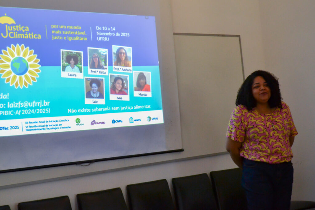 Em seguida, Manuelly da Silva Pereira, de Zootecnia, compartilhou a pesquisa “Cálculo do índice de calor para a UFRRJ entre os anos 2001 à 2024”. O estudo aponta aumento de dias classificados como “cuidado extremo”, especialmente na primavera e no verão, evidenciando impactos das mudanças climáticas nos ambientes rurais e urbanos.