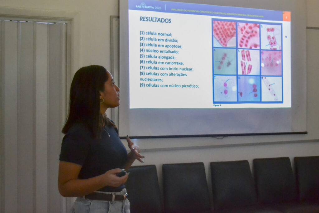 A estudante de Farmácia, Débora Moura Peixoto, apresentou o estudo “Avaliação do Potencial Genotóxico do Extrato Aquoso de Pereskia grandifolia Haw”, cujos resultados confirmam o potencial genotóxico da espécie e ampliam o debate sobre o uso indiscriminado de plantas medicinais.