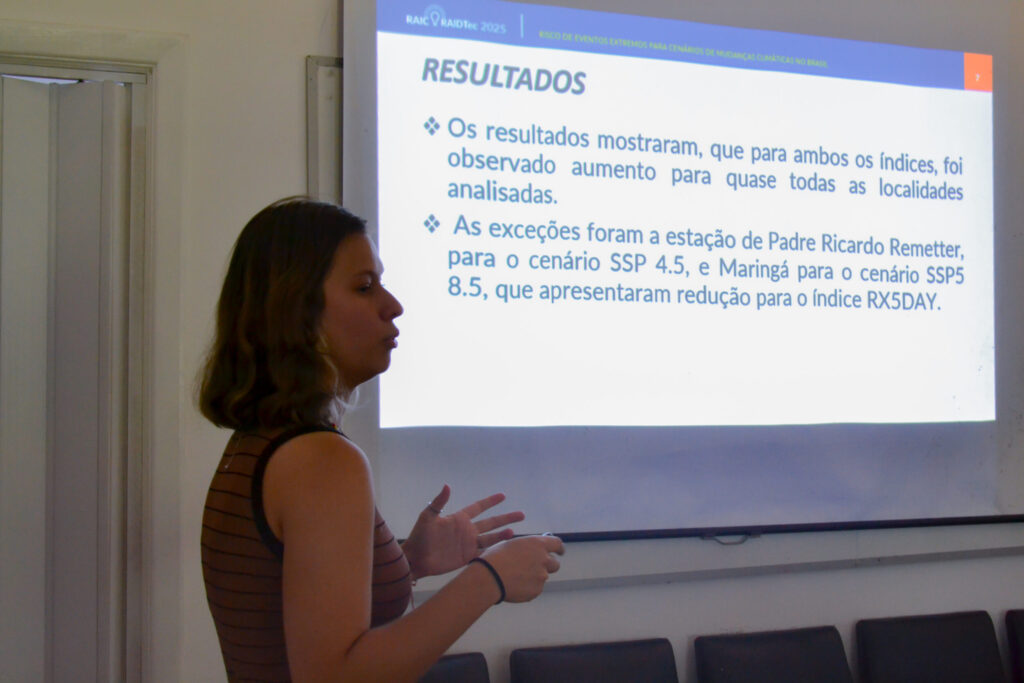 A estudante Thalita Fernandes apresentou o trabalho “Risco de Eventos Extremos para Cenários de Mudanças Climáticas no Brasil”, que revela aumento significativo em índices como RX1day e RX5day, indicando maior risco de enchentes e reforçando a necessidade de planejamento urbano e gestão hídrica mais resiliente.