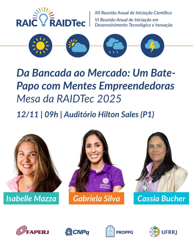 A VI Reunião Anual de Iniciação em Desenvolvimento Tecnológico e Inovação (RAIDTec 2025) da UFRRJ destaca em sua programação um painel voltado ao empreendedorismo. Na quarta-feira, 12 de novembro, às 9h, acontece a mesa redonda “Da Bancada ao Mercado: Um Bate-Papo com Mentes Empreendedoras”.