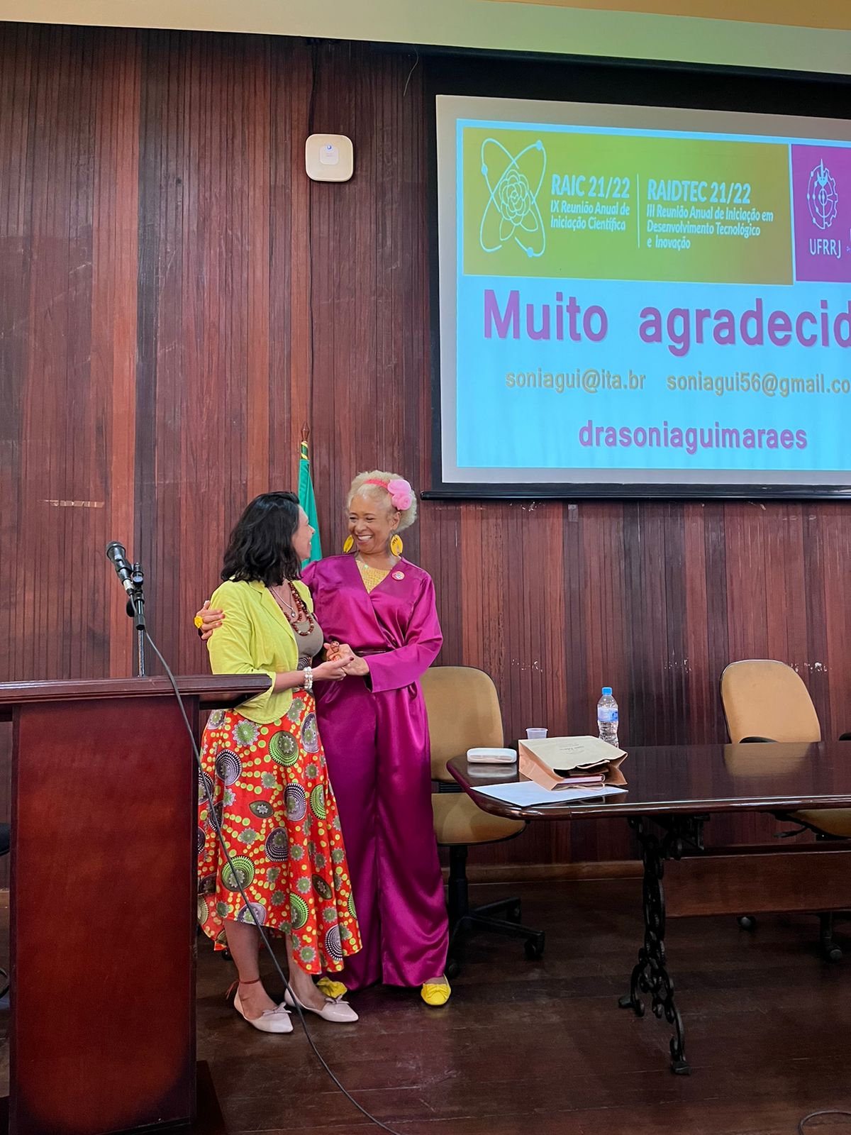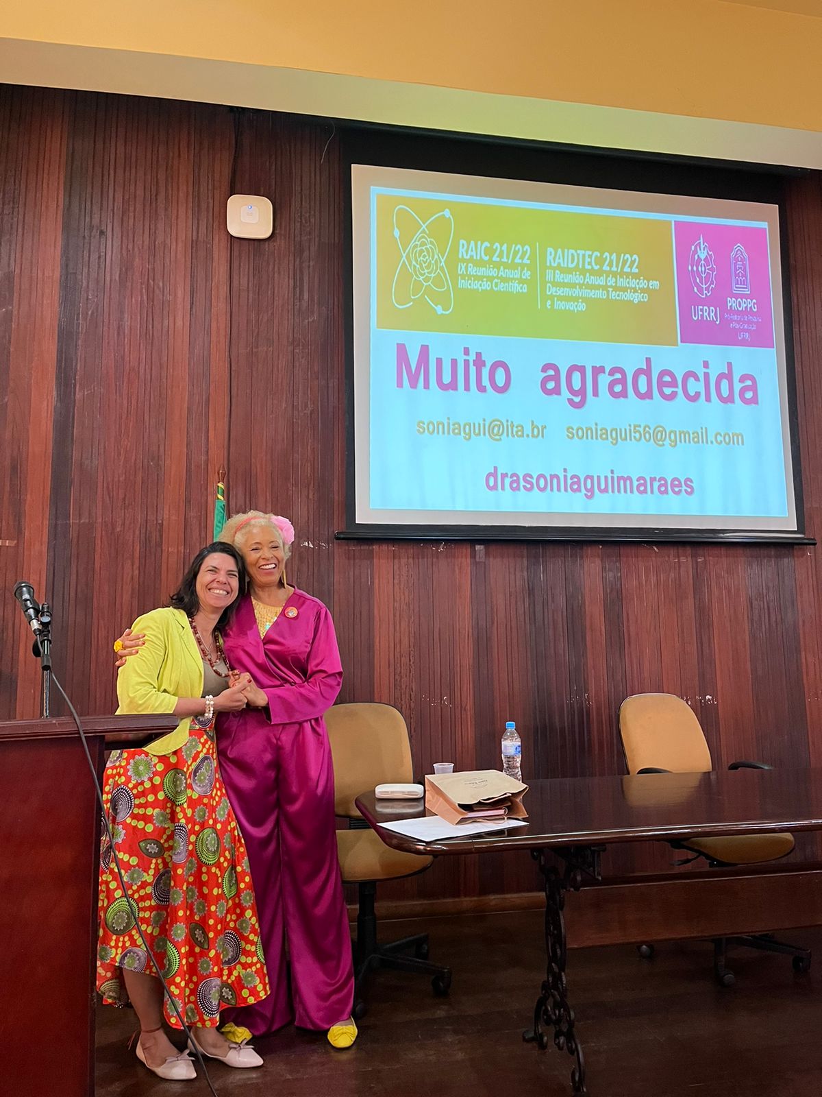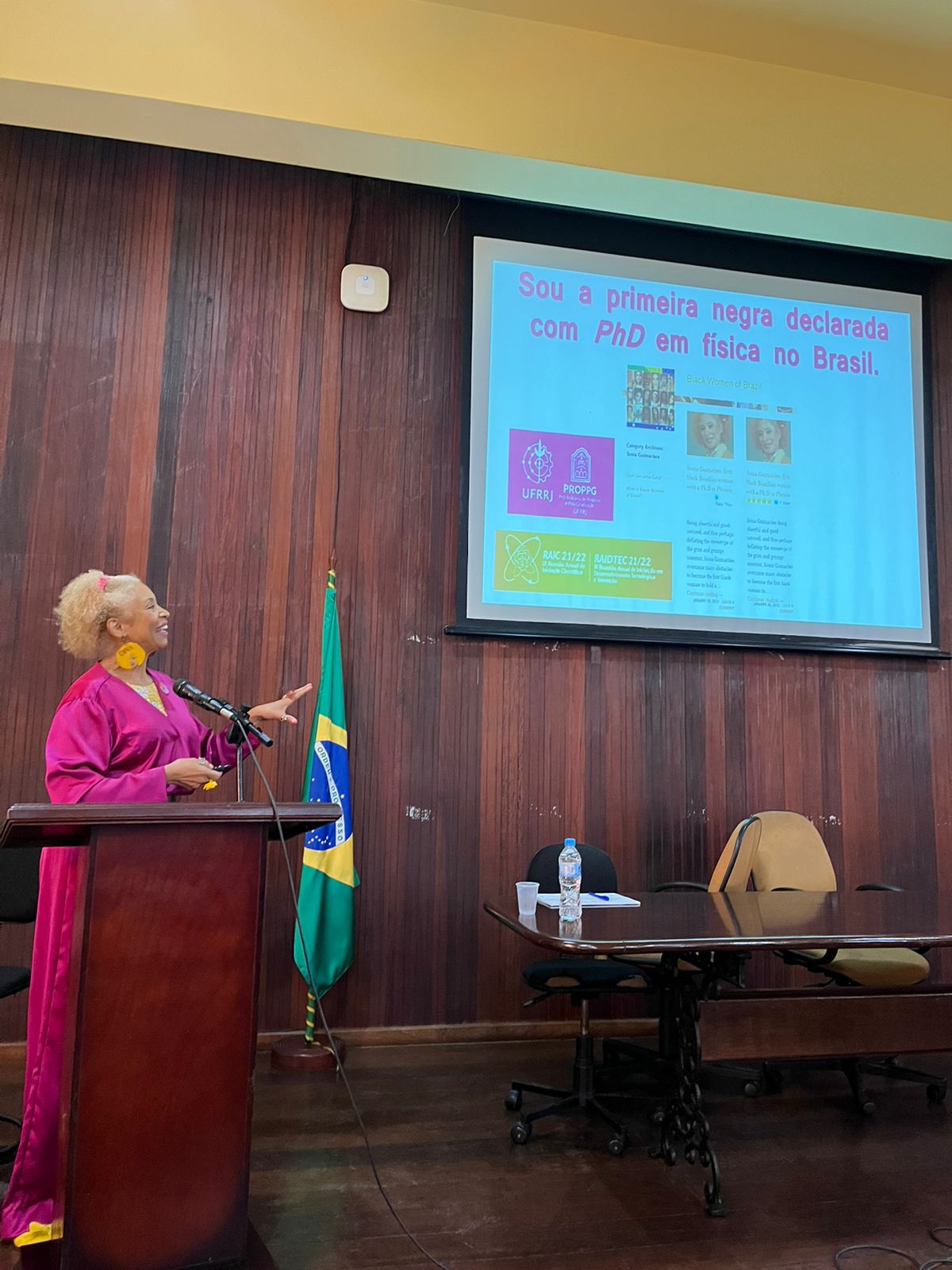 Antes mesmo de iniciar sua apresentação, a docente mostrou que estava vestida na paleta de cores do evento, em uma homenagem tanto à Universidade, como à designer Patricia Perez, servidora pública lotada na Coordenadoria de Comunicação Social (CCS/UFRRJ), que criou a identidade visual da edição 2021/2022 da RAIC e da RAIDTec. De rosa e amarelo, Sonia fez críticas contundentes à desigualdade de gênero no campo científico e trouxe para o público histórias de jovens cientistas brasileiras negras com contribuições nas áreas de Física, Química, Biomedicina e Matemática, como Katemari Rosa, Denise Alves Fungaro, Vivian Miranda, Joana D’Arc Félix de Souza, Jaqueline Goés de Jesus, Manuela da Silva Souza e Carleane Reis, além de exaltar os feitos de meninas ao ingressarem em instituições de ensino superior.