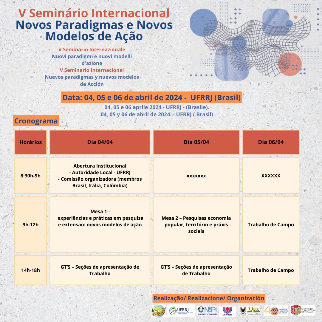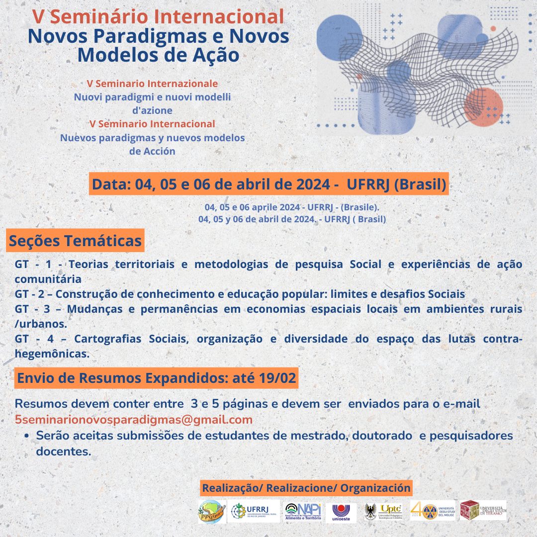 A UFRRJ vai receber, entre 4 e 6 de abril de 2024, o ‘V Seminário Internacional – Novos Paradigmas e Novos Modelos de Ação’. O evento é organizado por universidades do Brasil (Rural e Unioeste), Colômbia (UPTC) e Itália (Teramo e Molise).