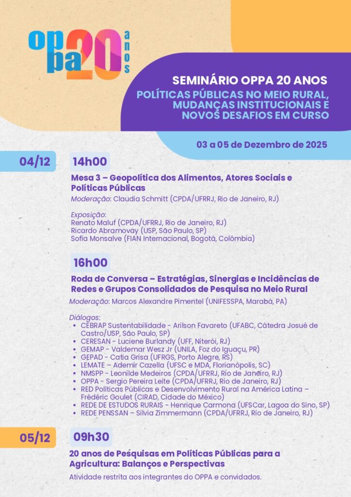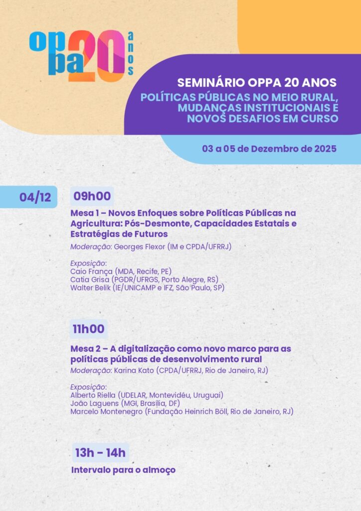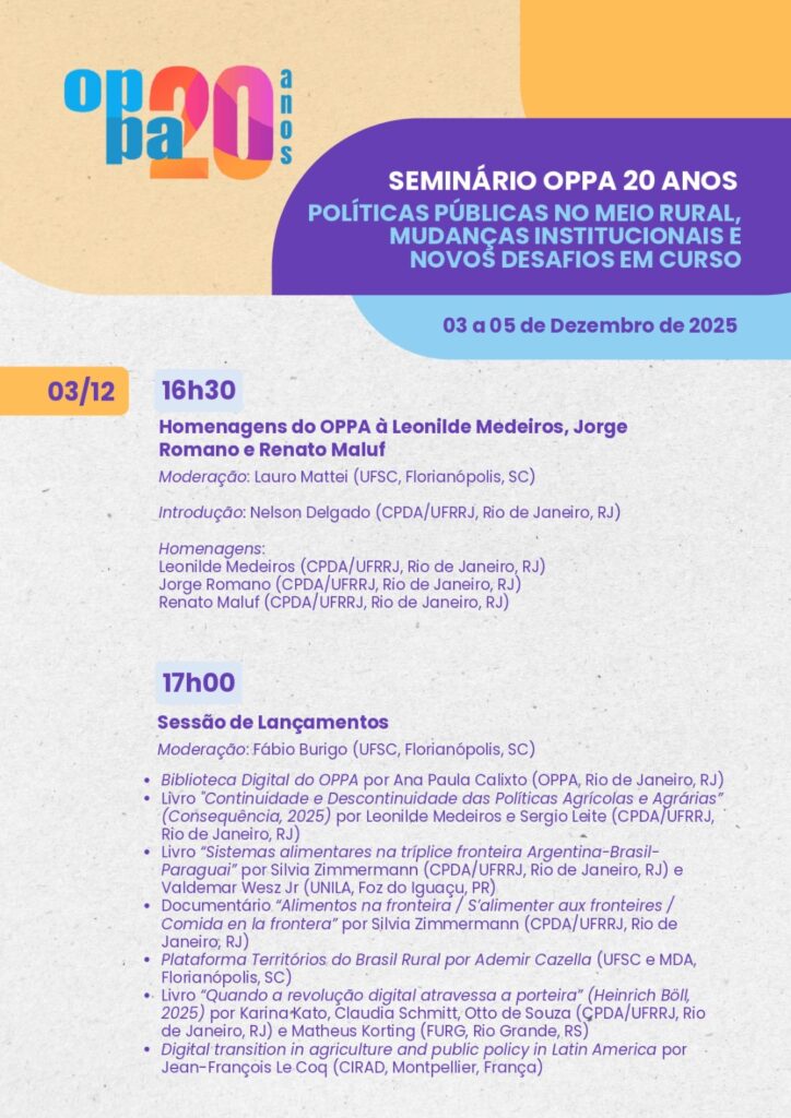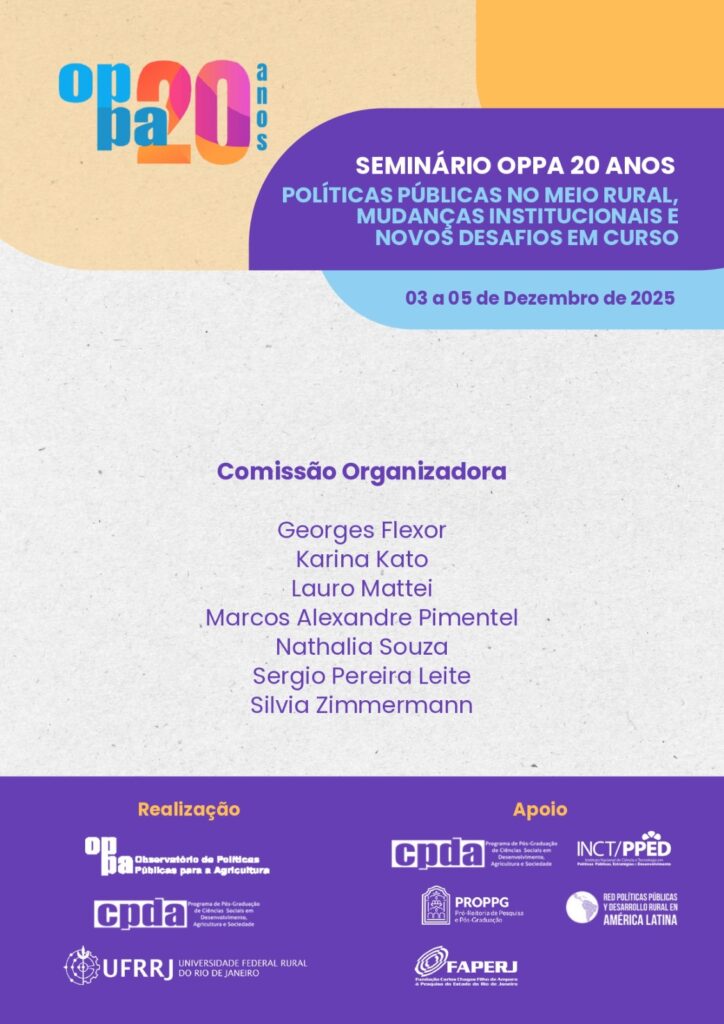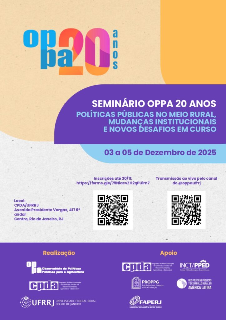 O Observatório de Políticas Públicas para a Agricultura (Oppa/UFRRJ) completa 20 anos e celebra sua trajetória com um seminário sobre temas ligados ao meio rural no Brasil e no exterior. Aberto ao público e gratuito, o evento ocorre em formato presencial e remoto, incluindo mesas de debate, lançamentos de publicações e roda de conversa entre grupos e redes de pesquisa.