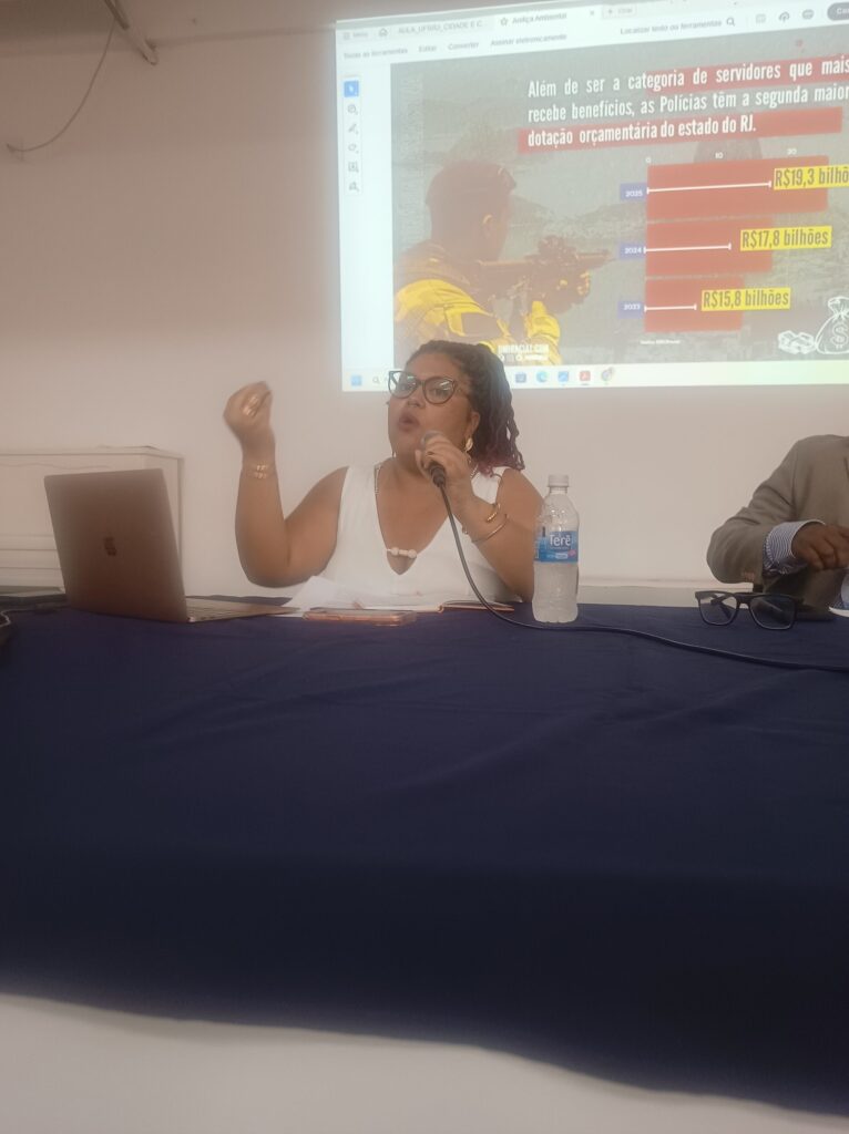 A próxima a fazer uso da palavra foi a mestranda Giselle Florentino, coordenadora-executiva da Iniciativa Direito à Memória e Justiça Racial, mestranda em Sociologia no Instituto de Estudos Sociais e Políticos (IESP) da UERJ.