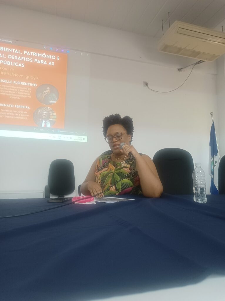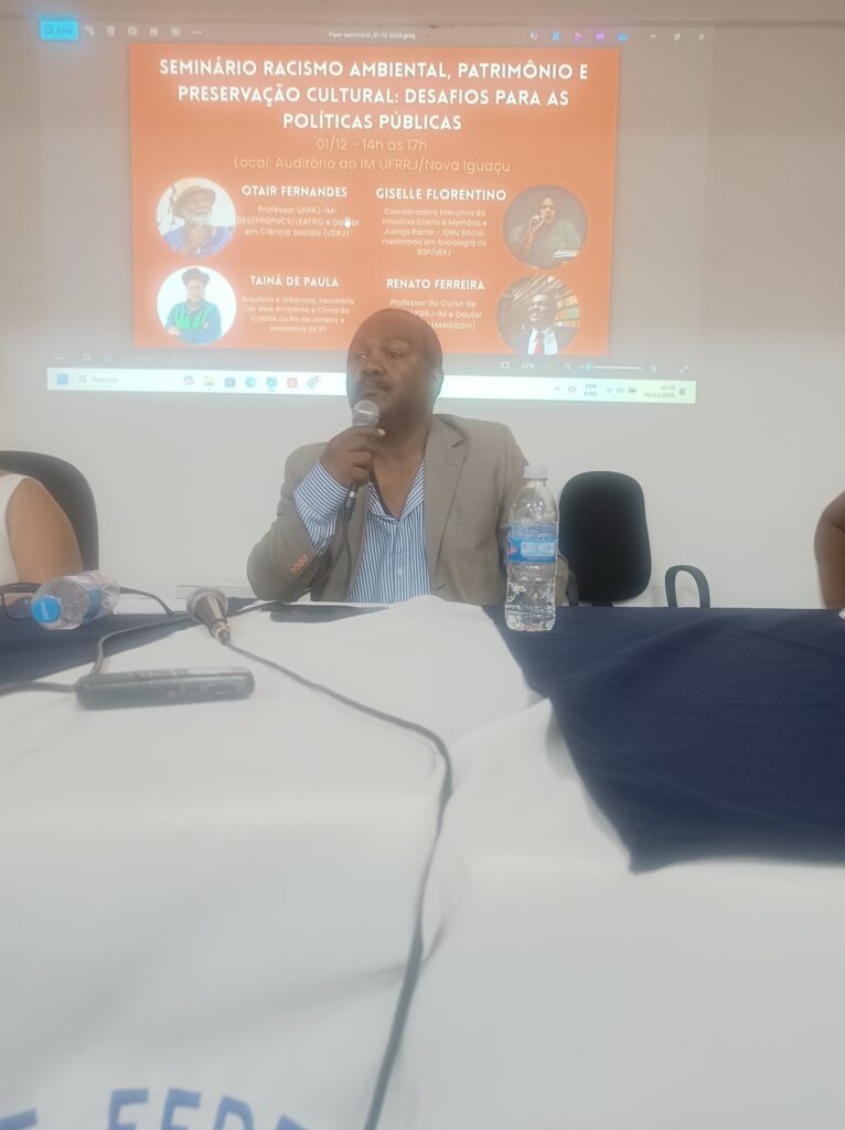 Numa promoção do LEAFRO/UFRRJ – Laboratório de Estudos Afro-brasileiros e Indígenas da Universidade Federal Rural do Rio de Janeiro, aconteceu no último dia 1º de dezembro o Seminário “Racismo Ambiental, Patrimônio e Preservação Cultural: desafios para as políticas públicas”. O evento teve lugar no auditório do Instituto Multidisciplinar (câmpus Nova Iguaçu da UFRRJ) e contou com as presenças do professor Renato Ferreira, do curso de Direito do IM/UFRRJ e doutor em Direito, o qual atuou como mediador; do professor Otair Fernandes, doutor em Ciências Sociais e professor do IM/UFRRJ e do PPGPaCS – Programa de Pós-Graduação em Patrimônio, Cultura e Sociedade; de Giselle Florentino, coordenadora-executiva da Iniciativa Direito à Memória e Justiça Racial, mestranda em Sociologia no Instituto de Estudos Sociais e Políticos (IESP), vinculado à UERJ; e da vereadora Tainá de Paula, arquiteta, urbanista e Secretária de Meio Ambiente e Clima da cidade do Rio de Janeiro.
