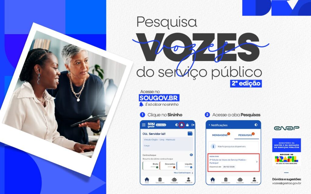 Para mais informações, acesse: https://www.gov.br/gestao/pt-br/assuntos/pesquisa-vozes
