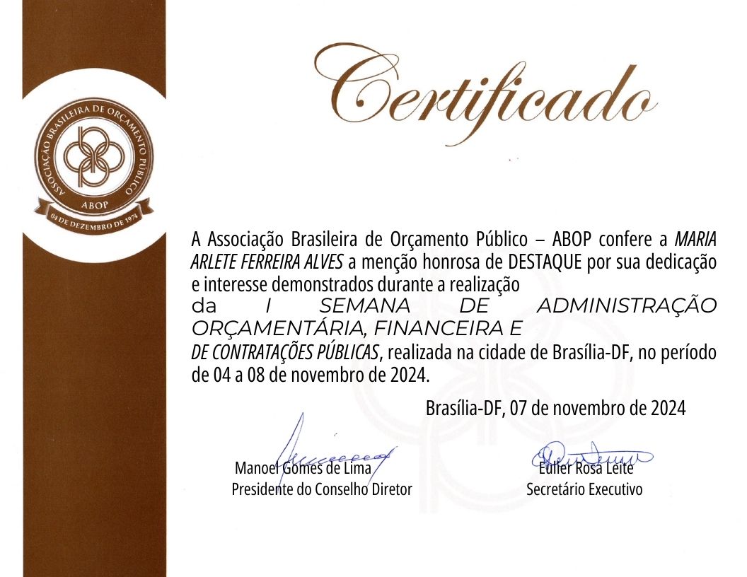Os servidores Evandro Carlos Silva Luciano, Rosália de Almeida Santos e Maria Arlete Ferreira Alves estiveram entre os alunos destaques na Semana de Administração Orçamentária, Financeira e de Contratações Públicas, realizada em Brasília/DF pela Associação Brasileira de Orçamento Público (Abop). Eles foram certificados por seus desempenhos nas oficinas.