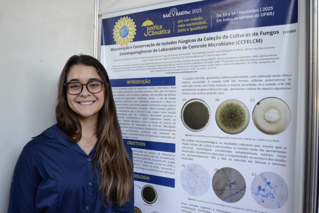 Entre os trabalhos expostos estava o de Gabriela Caetano, estudante de Medicina Veterinária, intitulado “Manutenção e Conservação de Isolados Fúngicos da Coleção de Culturas de Fungos Entomopatogênicos do Laboratório de Controle Microbiano (CCFELCM)”. A pesquisa busca aprimorar métodos de preservação de fungos usados no controle natural de insetos, reduzindo a necessidade de pesticidas químicos e contribuindo para uma agricultura mais sustentável.