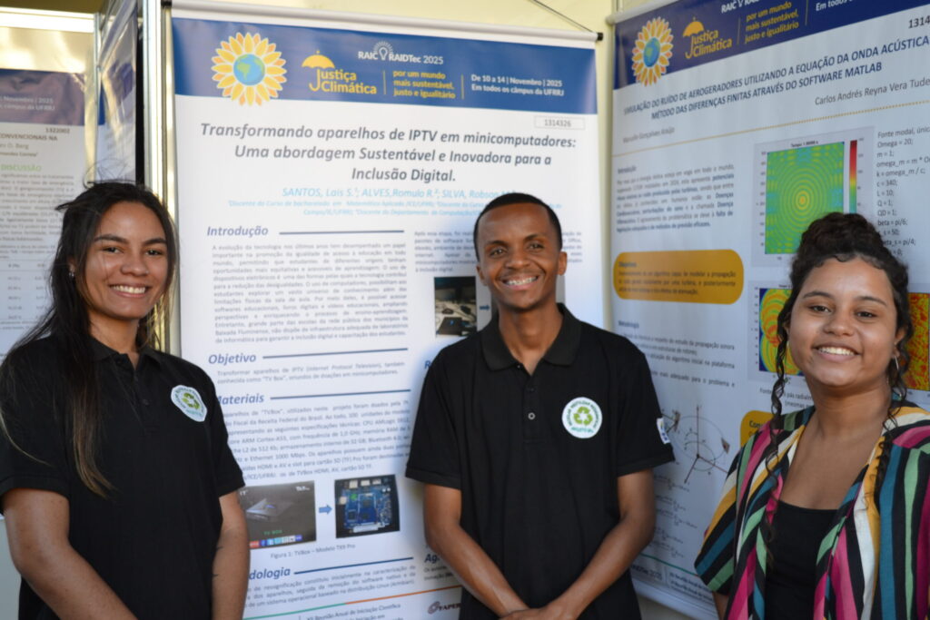 Na área de tecnologia, os estudantes Lais Santos, Rômulo Alves, discentes de Matemática Aplicada e Computacional e Educação do Campo, respectivamente, apresentaram o pôster “Transformando Aparelhos de IPTV em Minicomputadores: Uma Abordagem Sustentável e Inovadora para a Inclusão Digital”. O projeto reaproveita aparelhos de TV Box apreendidos pela Receita Federal, transformando-os em minicomputadores com sistema operacional Linux (Armbian). Os dispositivos podem ser doados para escolas públicas e comunidades, promovendo inclusão digital e diminuindo o descarte eletrônico.
