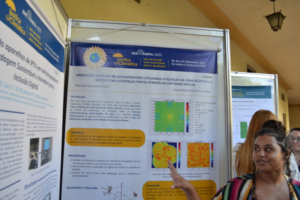 A estudante Manuelle Gonçalves Araújo, do curso de Engenharia Química, apresentou o trabalho “Simulação do Ruído de Aerogeradores Utilizando a Equação da Onda Acústica e o Método das Diferenças Finitas Através do Software MATLAB”. A pesquisa utiliza simulações matemáticas para analisar o ruído de turbinas eólicas e seus possíveis impactos em comunidades próximas, contribuindo para políticas de energia renovável mais eficientes.
