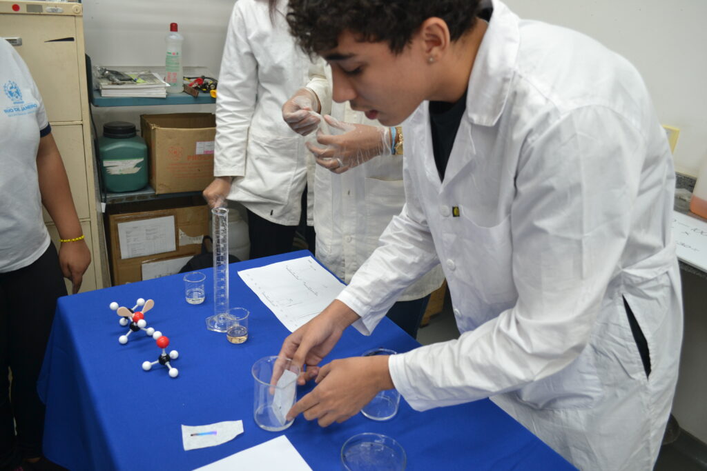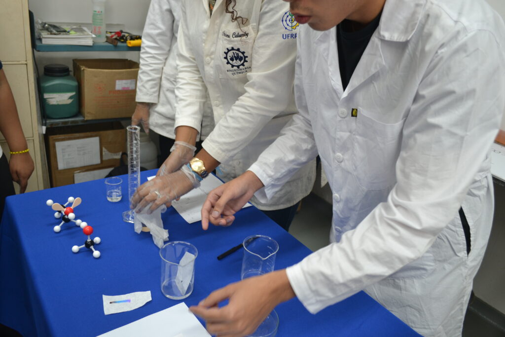 A outra atividade do curso foi a “Materiais na Engenharia Química”, onde foram escolhidos três grupos. O primeiro foi o carvão ativado, usado para fazer adsorção, explicando os mecanismos e o uso dessa técnica na disciplina. Como segundo material, foi utilizado o ovo de galinha, para apresentar suas membranas e como elas ficam em diferentes condições químicas. O terceiro grupo foi o dos catalisadores, que foram usados para uma prática abordando a cinética e, a partir disso, relacionando-a com a indústria química.
