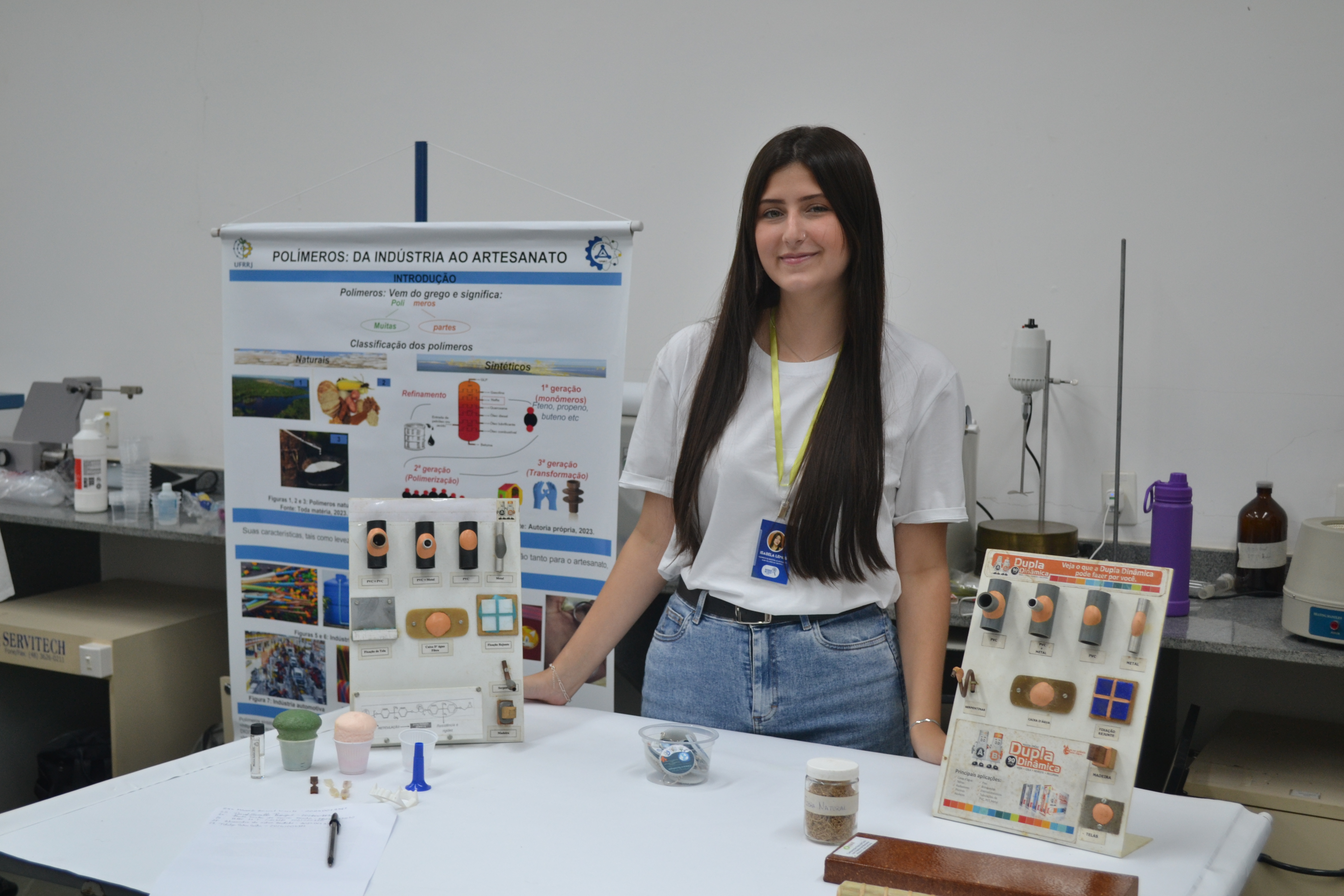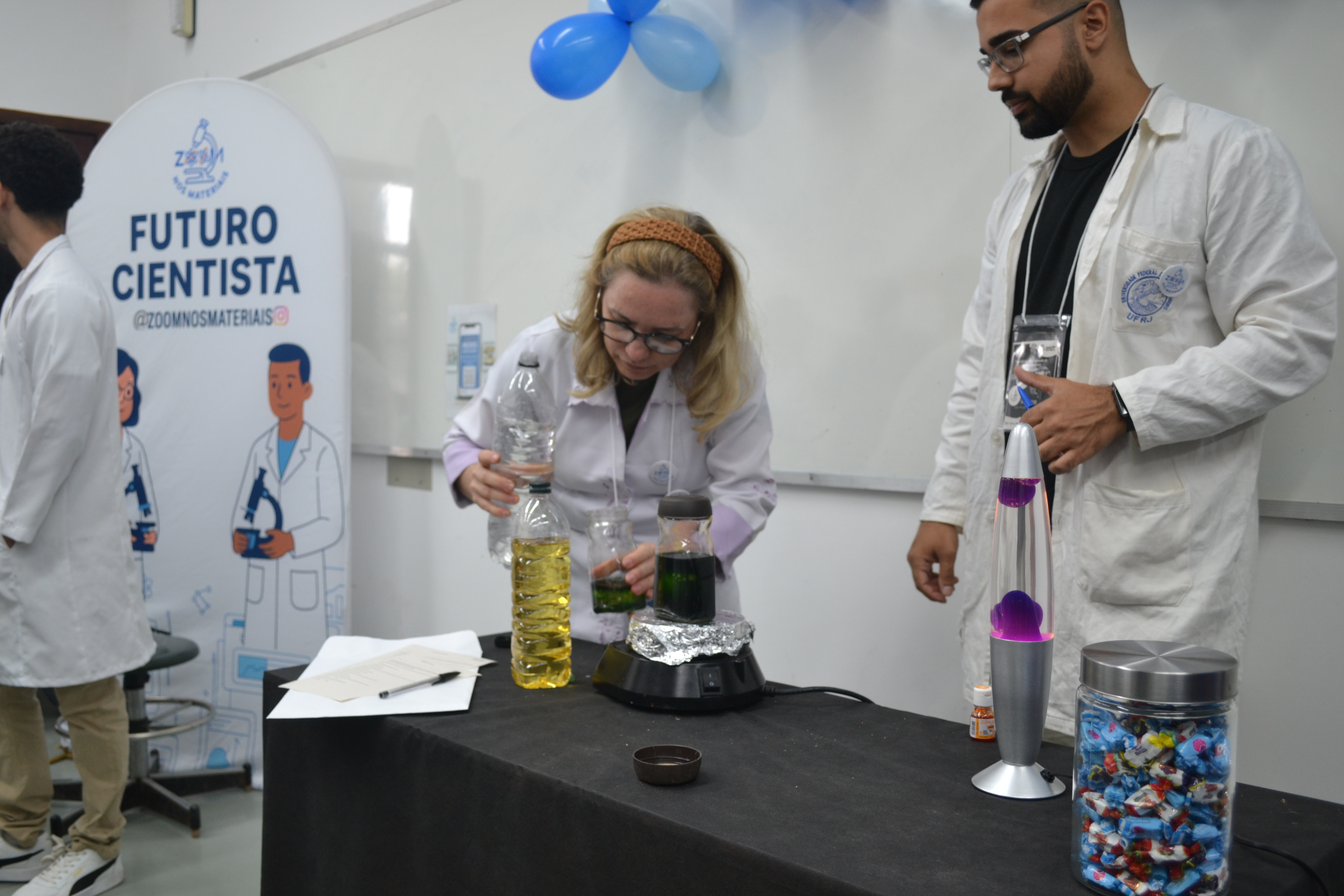 Já no Departamento de Engenharia Química (DEQ/IT), pela tarde, aconteceu a feira de exposição “Materiais em Foco”, que contou com mostras científicas dos cursos de Engenharia Química e Engenharia de Materiais. O evento foi planejado por professores de ambos os cursos, para compartilharem diferentes atividades, demonstrativas e expositivas, de diversas especificidades e profissionais dessas Engenharias.