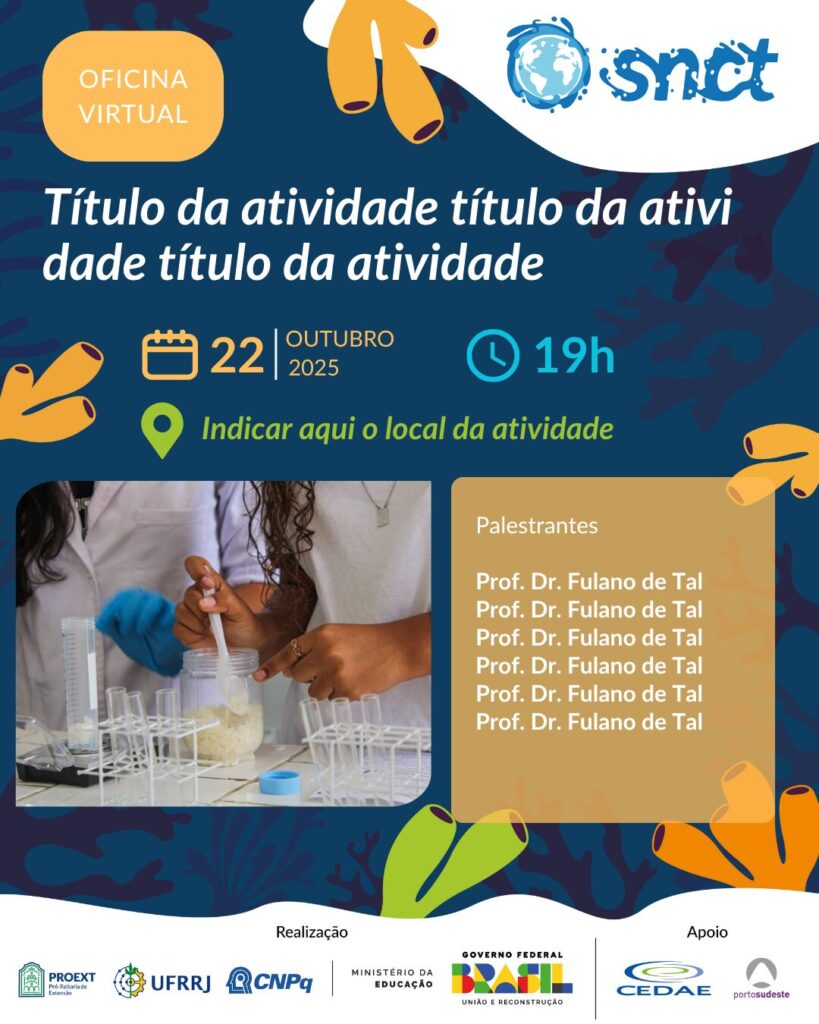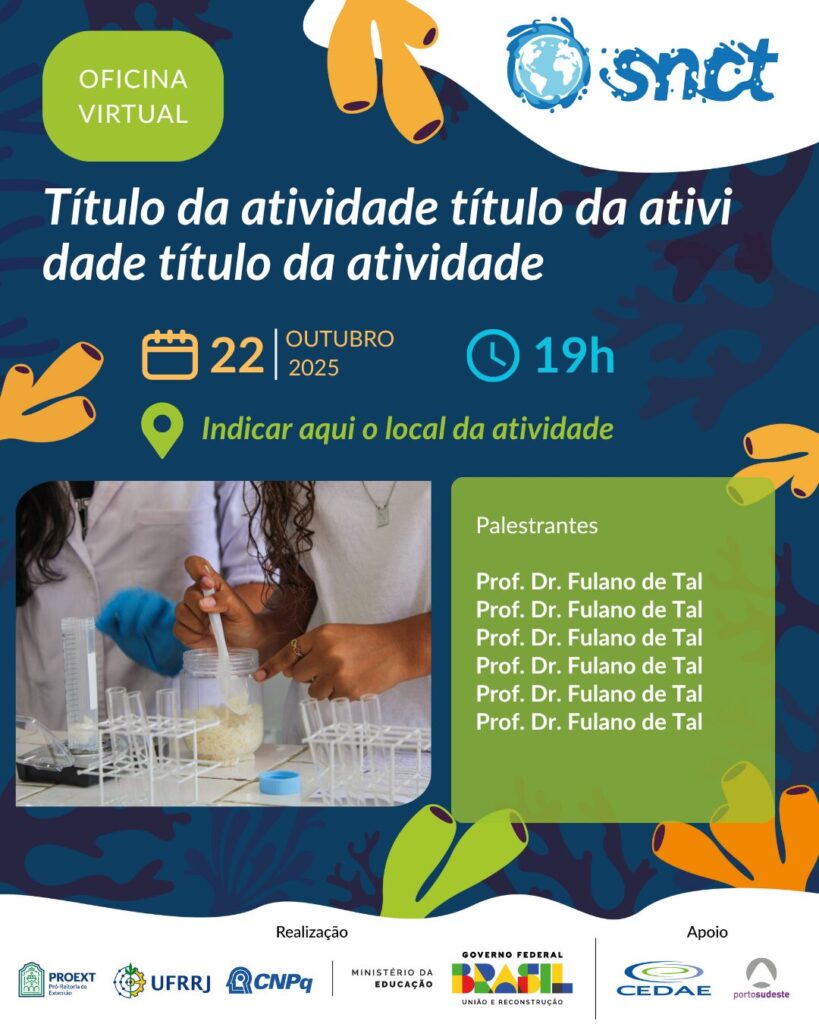 De acordo com o tutorial publicado pela SNCT, a edição dos cards é simples: basta fazer uma cópia do modelo no Canva, substituir os dados da atividade e realizar o download do material pronto para divulgação. Dessa forma, cada instituição poderá personalizar seu card de maneira rápida e eficiente, mantendo a identidade visual da Semana.