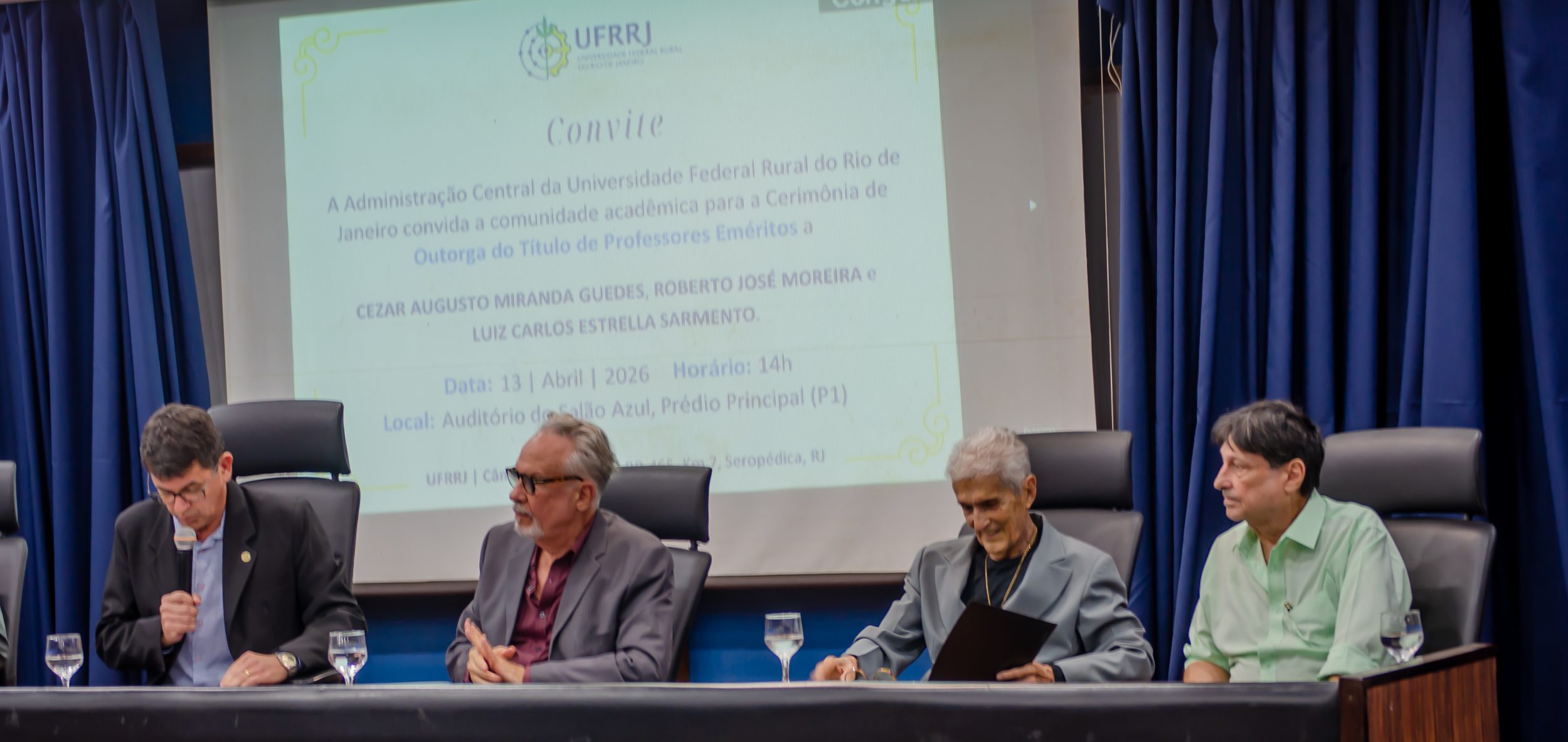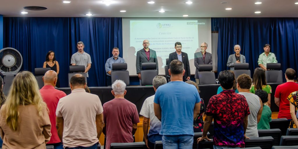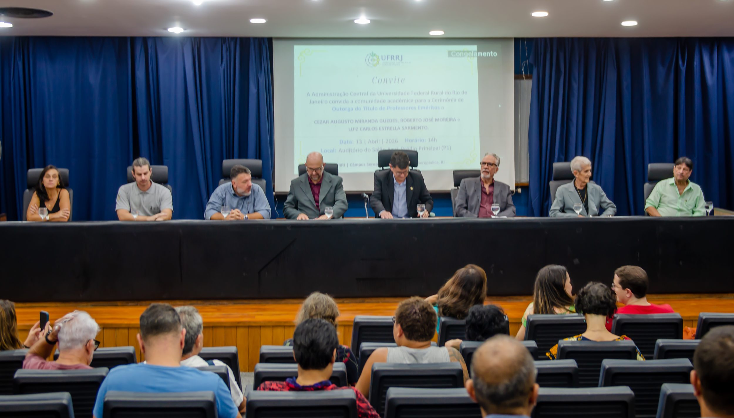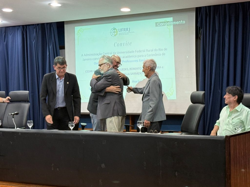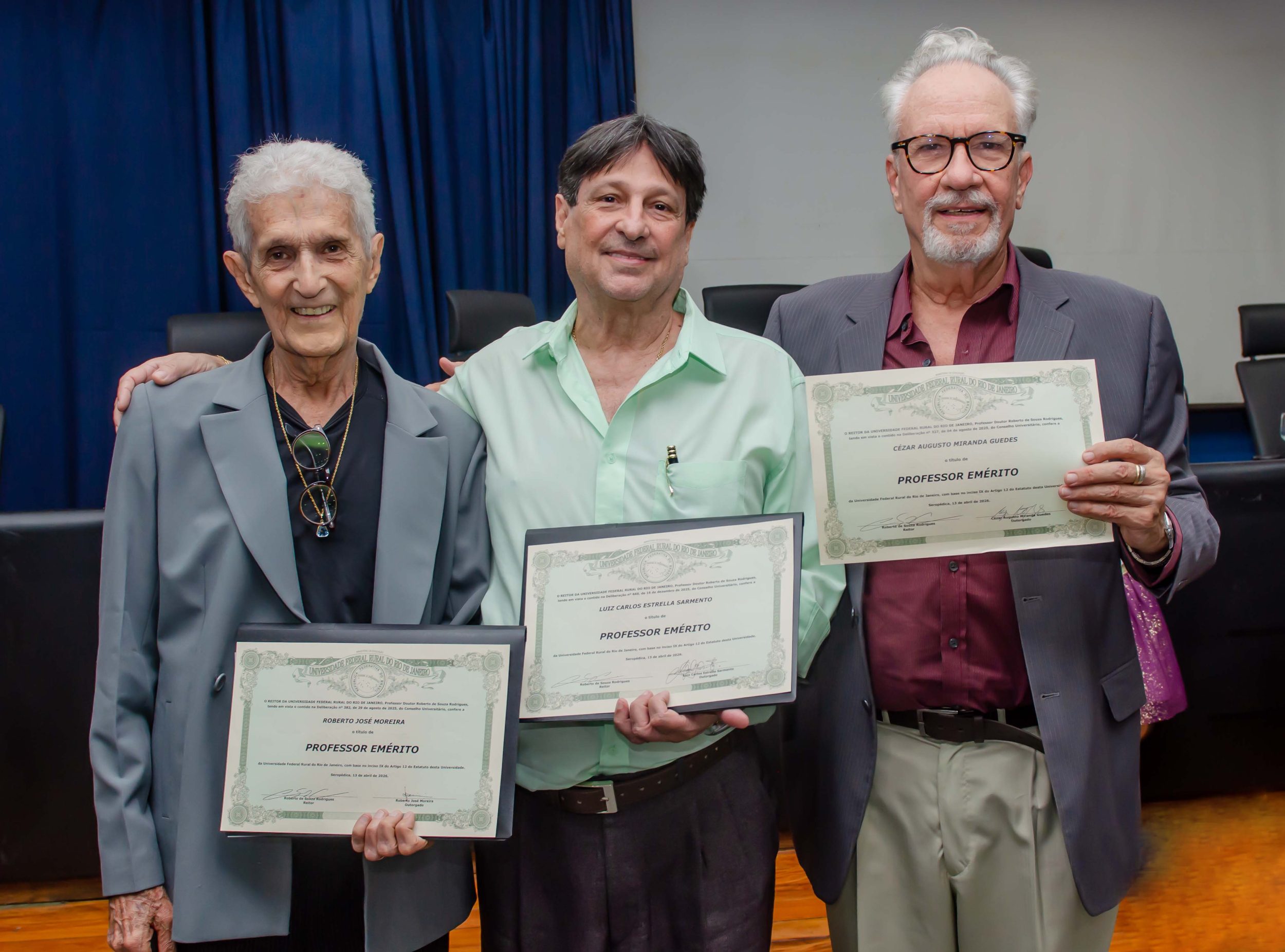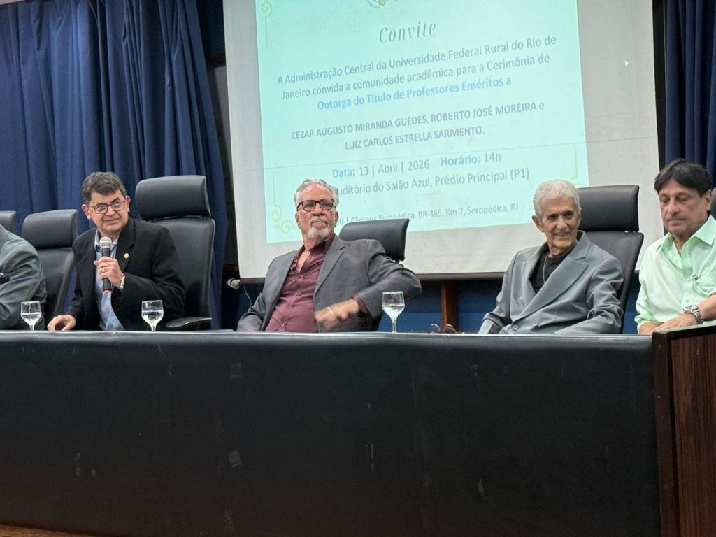 Na última segunda-feira (13/04), a Administração Central da Universidade Federal Rural do Rio de Janeiro (UFRRJ) realizou a cerimônia que concedeu o título de professores eméritos a Cezar Augusto Miranda Guedes, Roberto José Moreira e Luiz Carlos Estrella Sarnento. A honraria é dada a professores aposentados em reconhecimento a contribuições notáveis no ensino, pesquisa e extensão da instituição. O evento foi realizado no Auditório Professor Gusmão, no Pavilhão Central da UFRRJ.