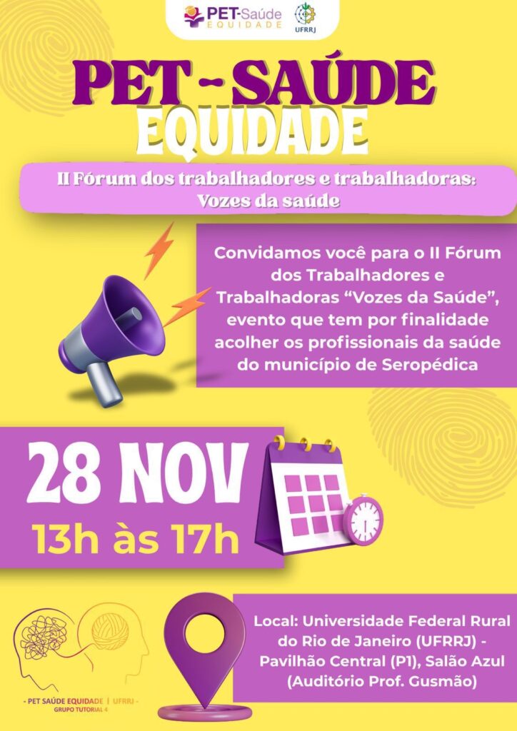 O Programa de Educação pelo Trabalho para a Saúde e Equidade (PET-Saúde Equidade) da Universidade Federal Rural do Rio de Janeiro (UFRRJ) convida trabalhadores e trabalhadoras da saúde do município de Seropédica para o II Fórum dos Trabalhadores e Trabalhadoras: Vozes da Saúde.