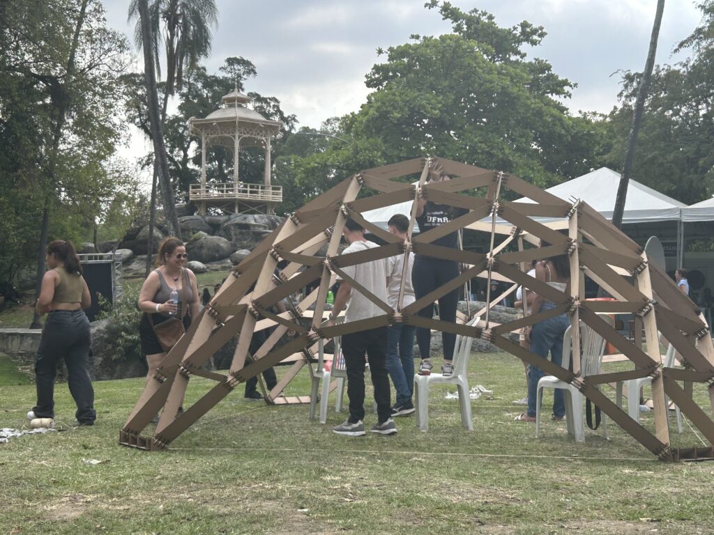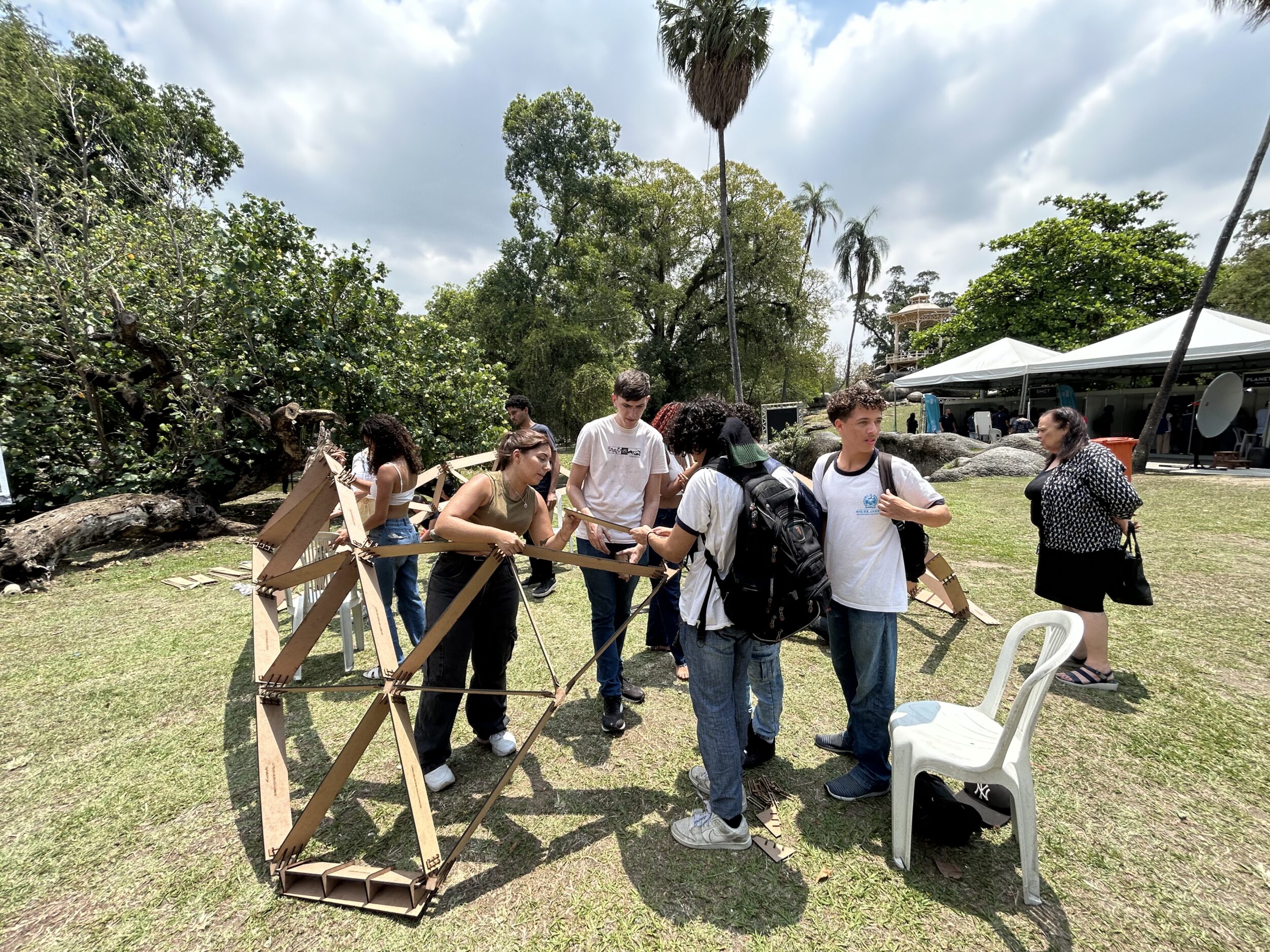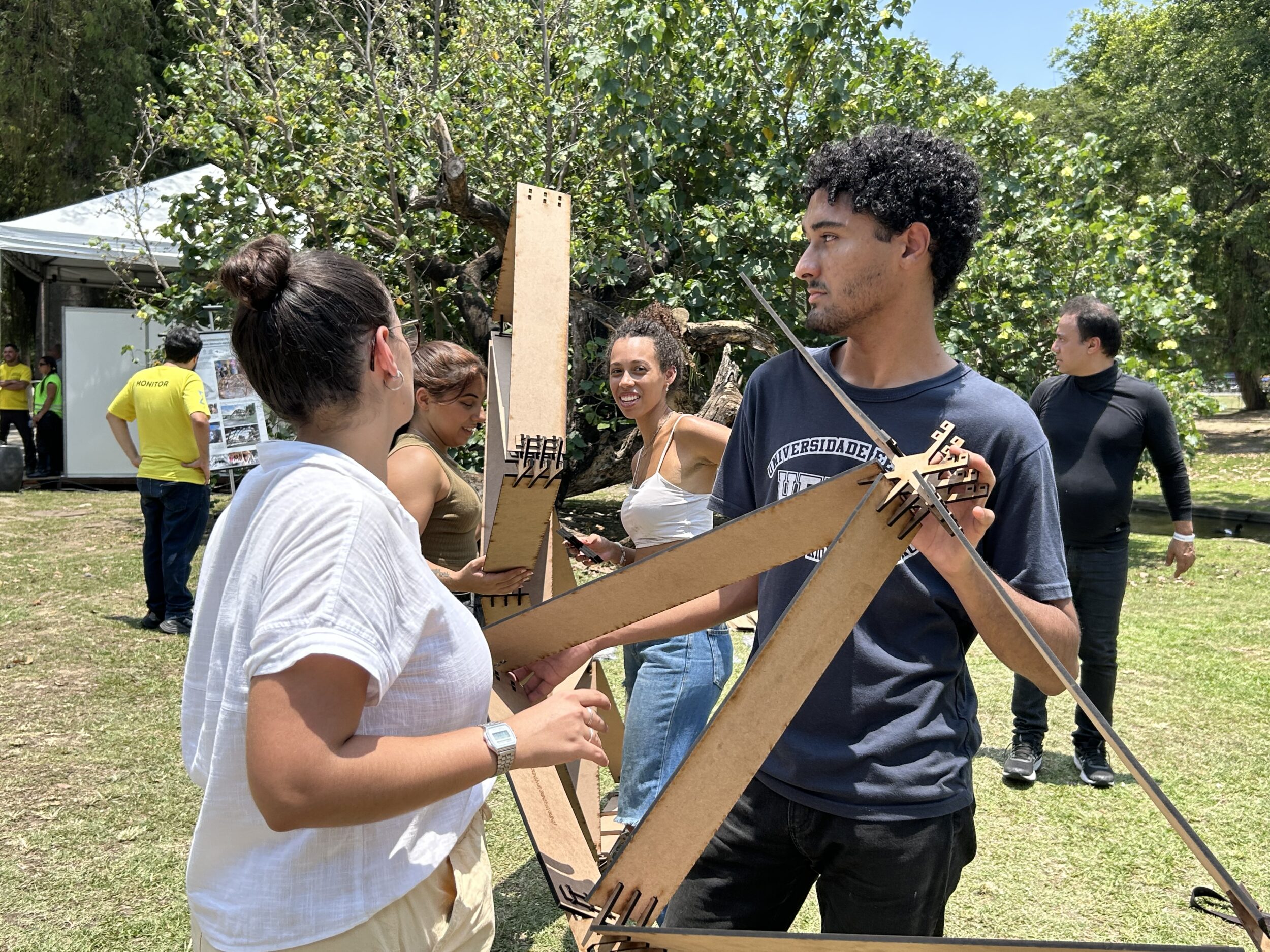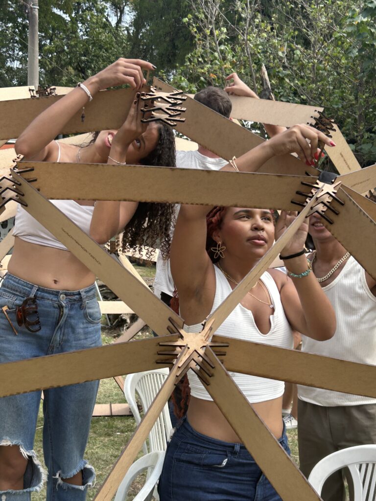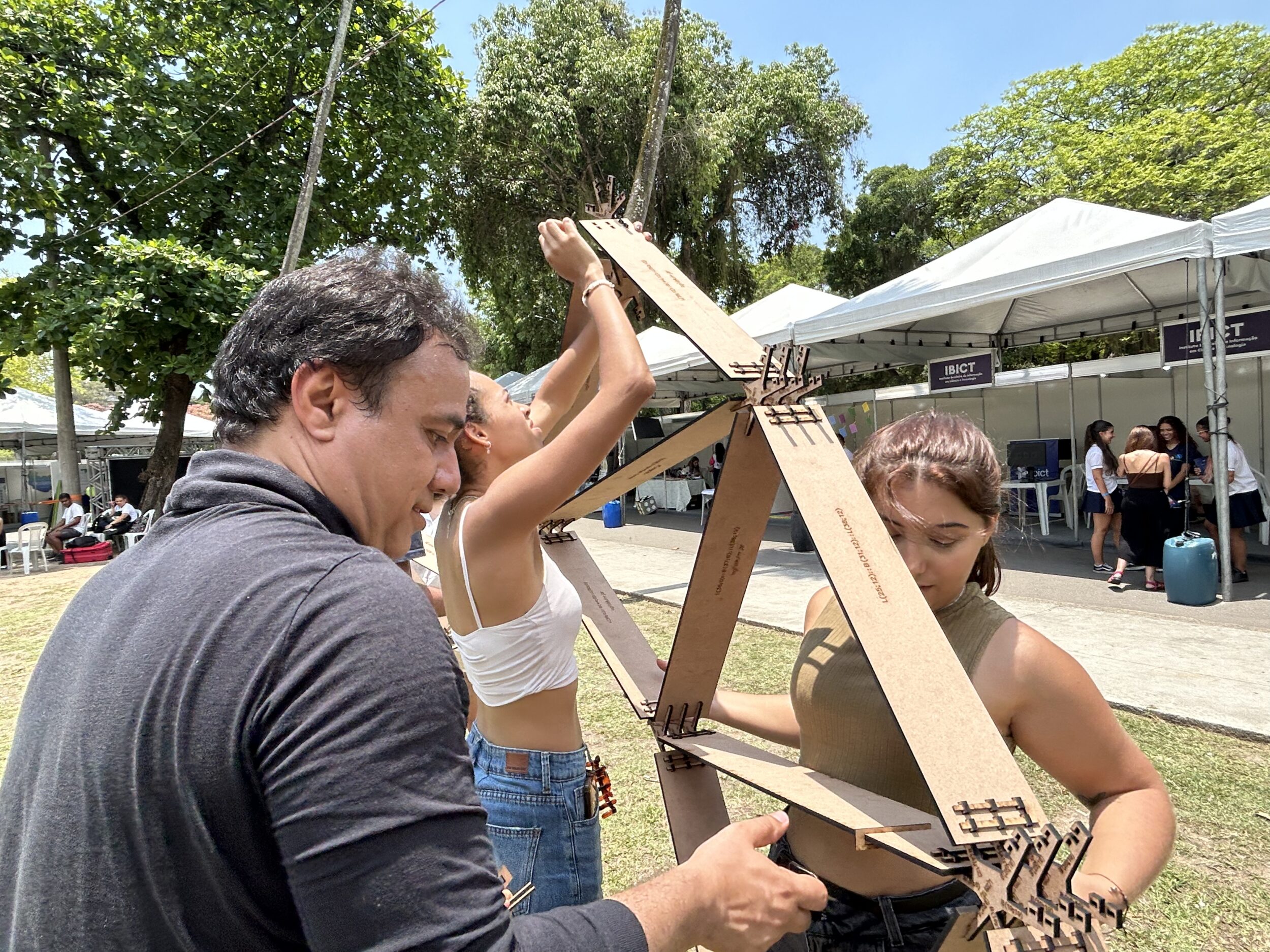 Nas imagens, estudantes de Arquitetura da UFRRJ instalam a estrutura efêmera em MDF no Festival da Ciência pelo Clima.