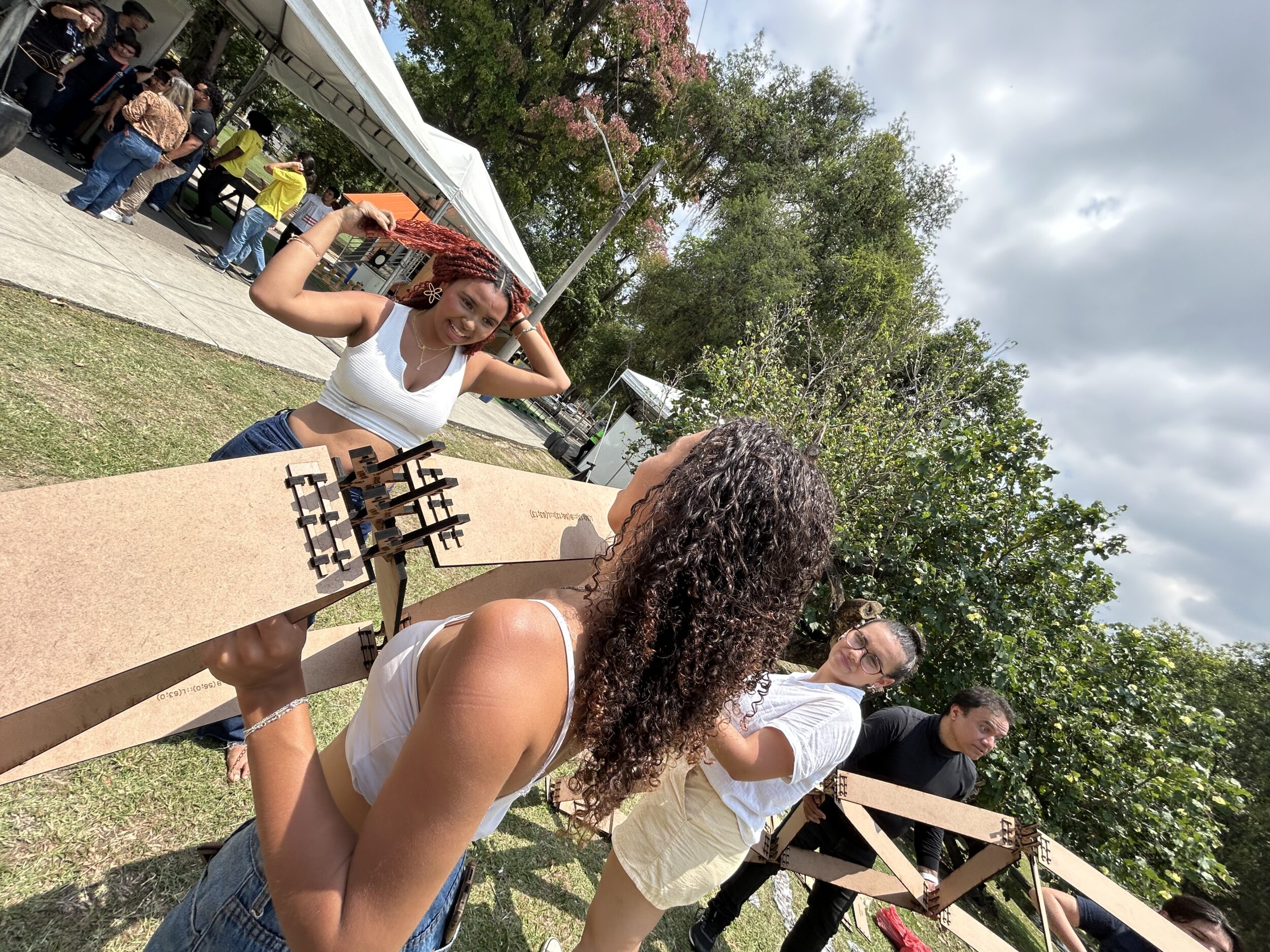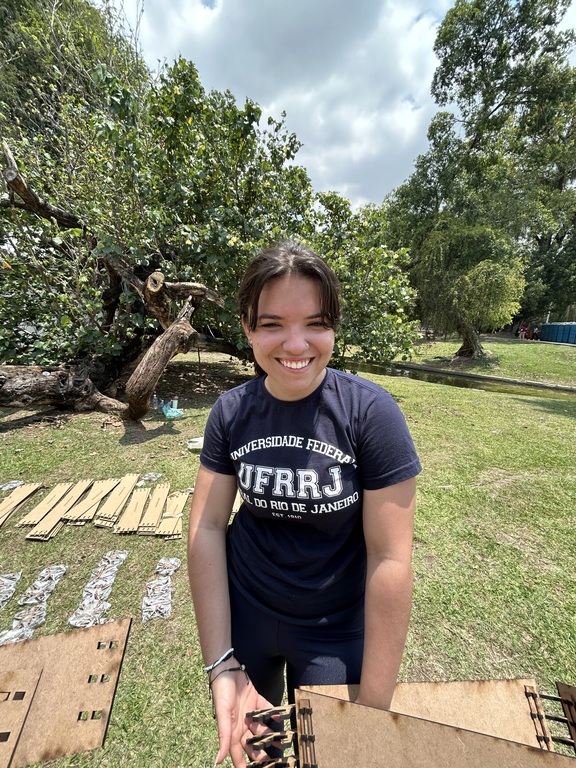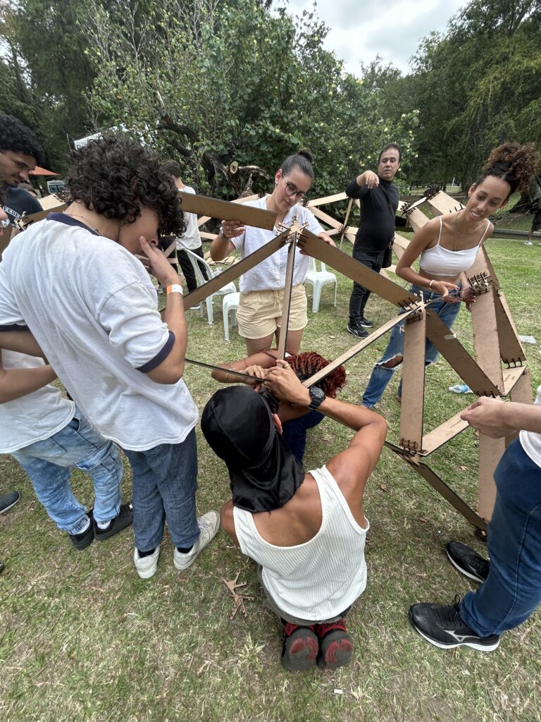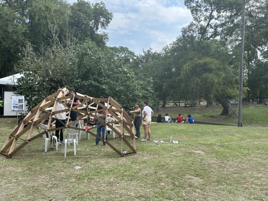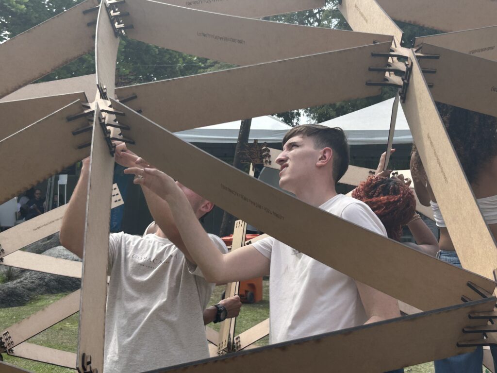 Nas imagens, estudantes de Arquitetura da UFRRJ instalam a estrutura efêmera em MDF no Festival da Ciência pelo Clima.