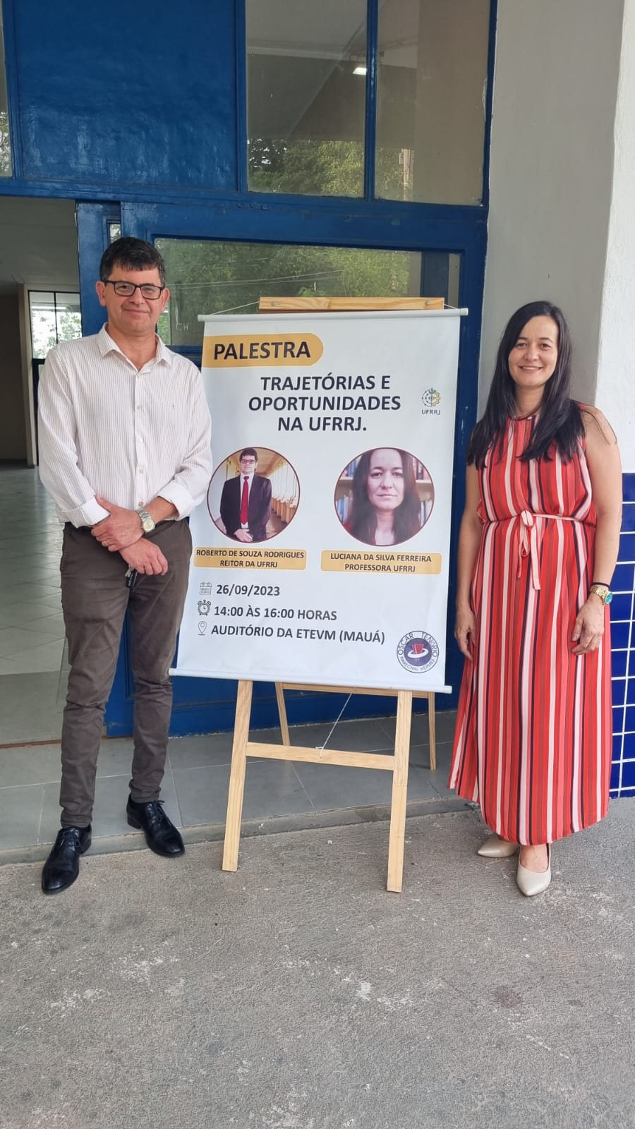 Em evento realizado na Fundação de Apoio à Escola Técnica (Faetec) de Marechal Hermes, em 26/9, o reitor da Universidade Federal Rural do Rio de Janeiro (UFRRJ) Roberto de Souza Rodrigues e a professora de Economia da UFRRJ, Luciana da Silva Ferreira, discutiram trajetórias e apresentaram algumas das oportunidades oferecidas pela maior Universidade pública da Baixada Fluminense.