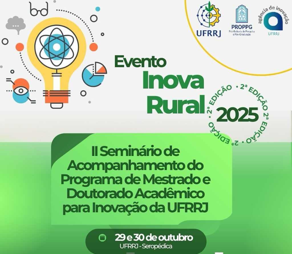 A Universidade Federal Rural do Rio de Janeiro (UFRRJ), por meio da Agência de Inovação e da Pró-Reitoria de Pesquisa e Pós-Graduação (PROPPG), promove nos dias 29 e 30 de outubro de 2025 o II INOVARural — evento que integra o Seminário de Acompanhamento do Programa MAI/DAI (CNPq) e o Ideathon, uma maratona de ideias voltada à criação de soluções tecnológicas e sustentáveis para desafios do agronegócio e da inovação rural.